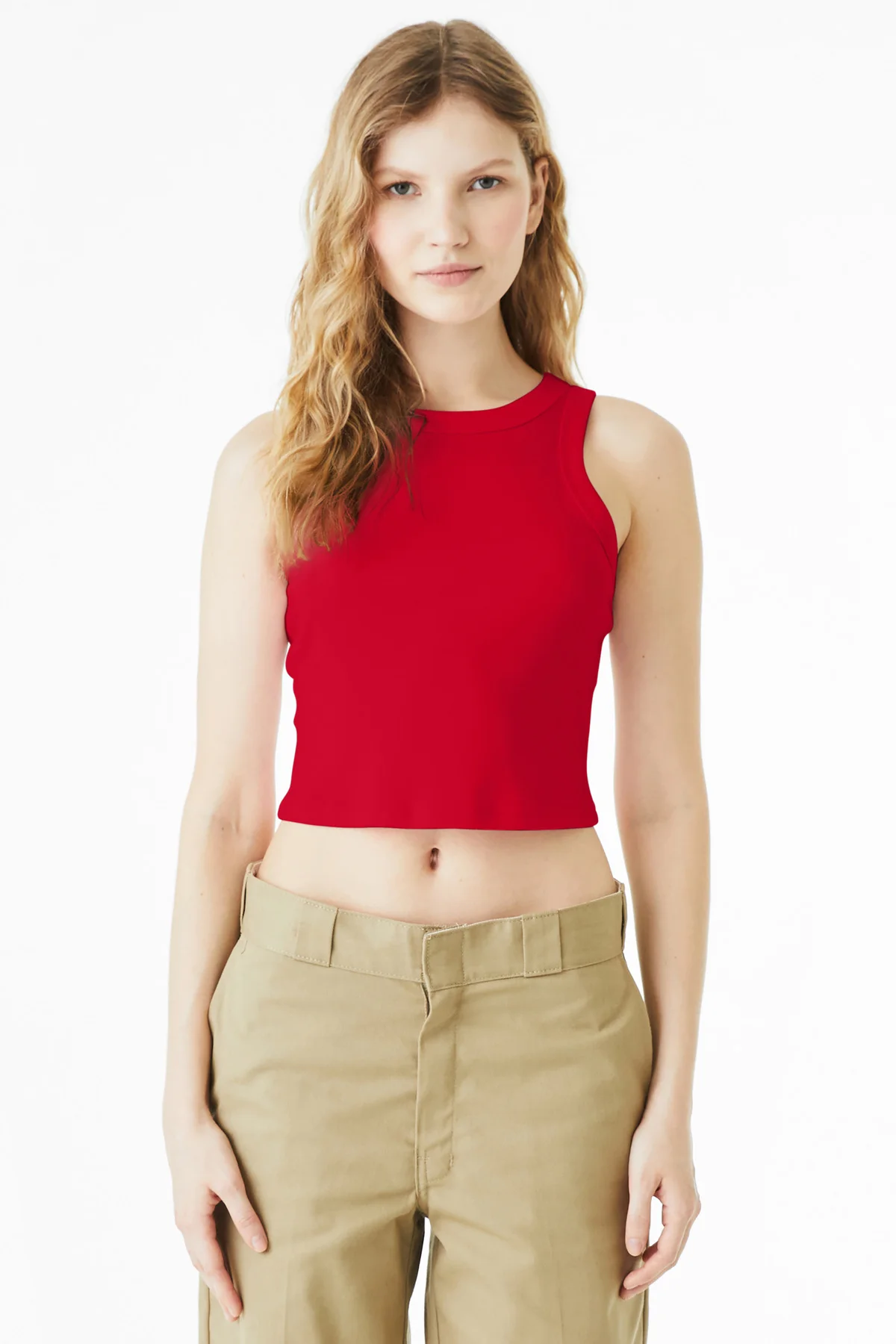 The high-neck racerback silhouette allows freedom of movement while maintaining a modern, athletic-inspired look. Micro ribbing at the neckline and armholes adds subtle texture, while side seams provide shape and structure. Mid-length design pairs effortlessly with high-waist bottoms or layered under jackets and cardigans.