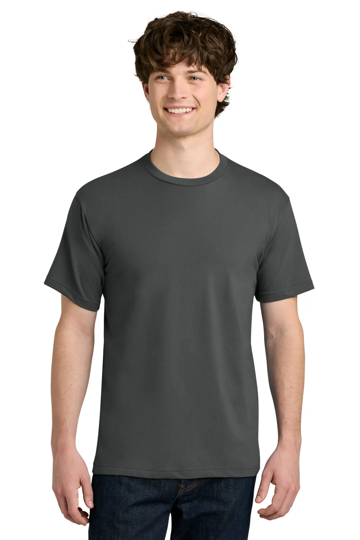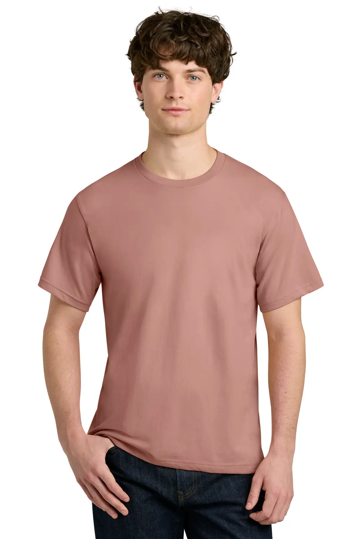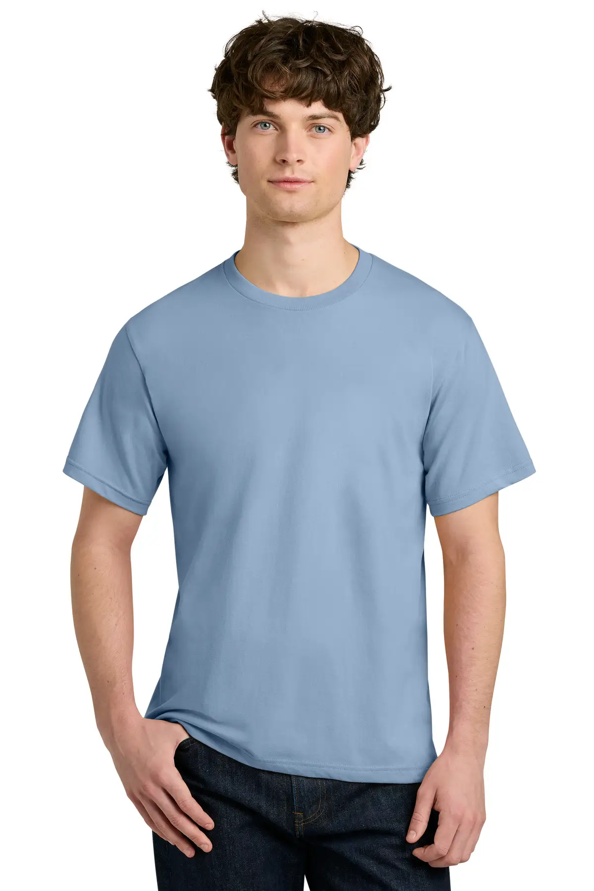 This lightweight jersey tee is crafted for all-day comfort from 5.6-ounce 100% carded ring-spun cotton (90/10 cotton/poly for Heather Gray). The 1x1 rib knit neck and shoulder-to-shoulder taping enhance structure, while side-seamed construction (except 4XL) ensures a flattering fit. Tubular construction in other sizes provides soft, relaxed drape. Tear-away label adds comfort and easy customization. Regular fit makes it perfect for layering or solo wear.