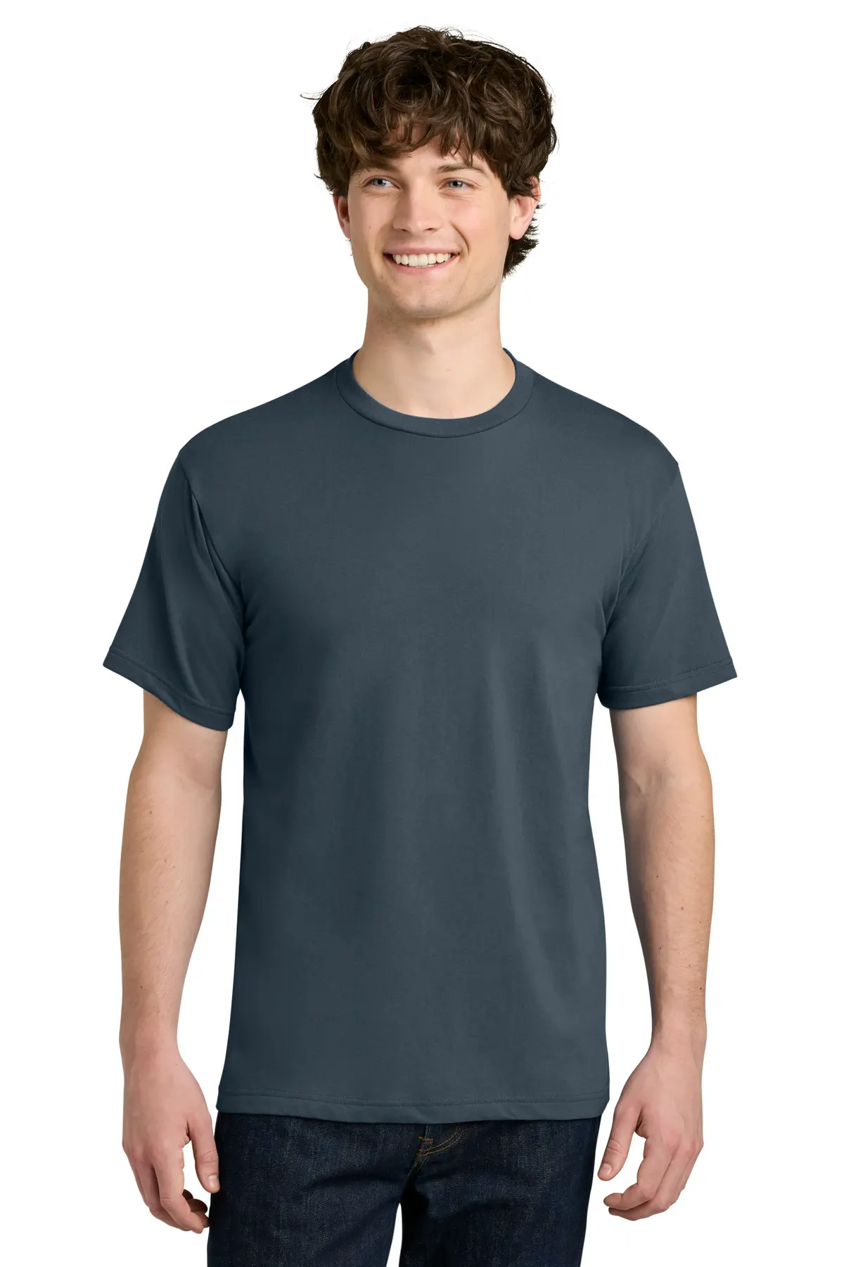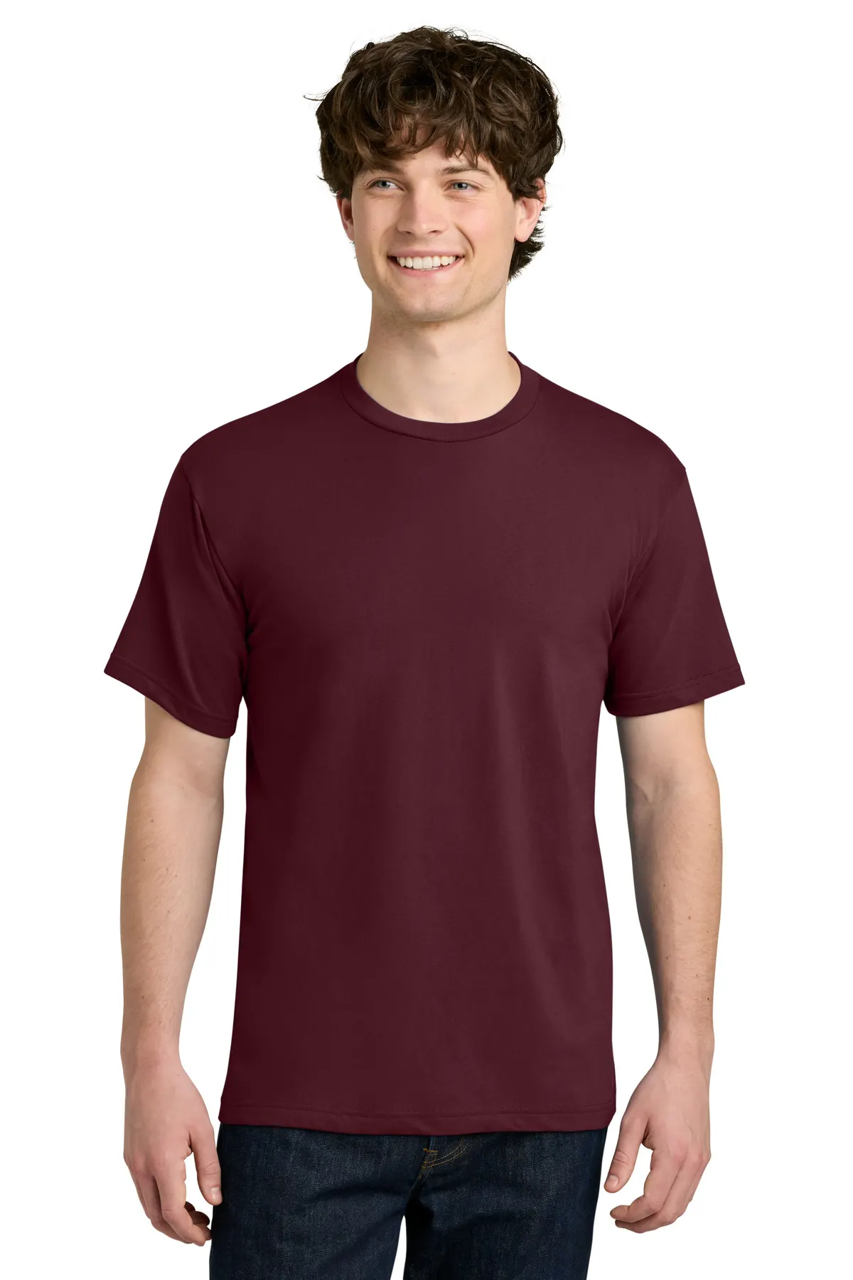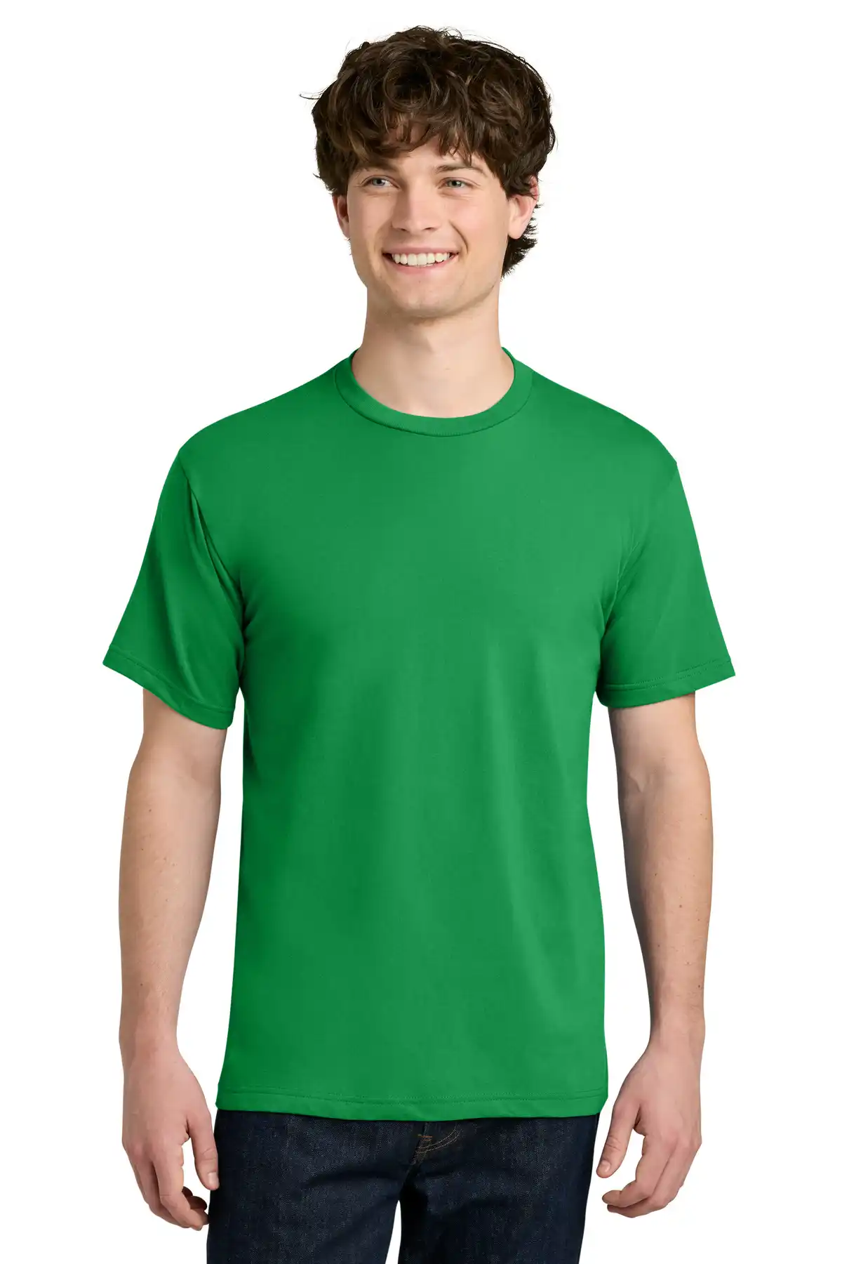 This lightweight jersey tee is crafted for all-day comfort from 5.6-ounce 100% carded ring-spun cotton (90/10 cotton/poly for Heather Gray). The 1x1 rib knit neck and shoulder-to-shoulder taping enhance structure, while side-seamed construction (except 4XL) ensures a flattering fit. Tubular construction in other sizes provides soft, relaxed drape. Tear-away label adds comfort and easy customization. Regular fit makes it perfect for layering or solo wear.