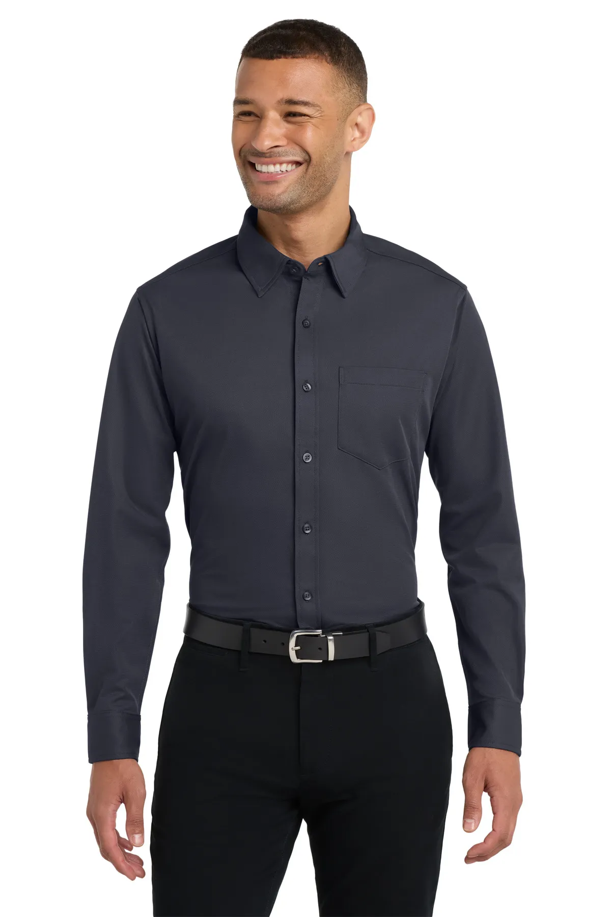 The Port Authority Dimension Knit Dress Shirt blends the comfort of a knit with the crisp appearance of a woven shirt. Designed for modern professionals and commuters, this shirt offers moisture-wicking performance to keep you dry throughout the day. The micropique polyester tricot fabric provides stretch and ease of movement without sacrificing structure. A versatile collar can be worn open for a relaxed look or buttoned down for a more formal appearance. The lightweight construction ensures breathability and comfort during long hours. Dyed-to-match buttons maintain a clean, professional finish. A left chest pocket adds functional detail. Rounded adjustable cuffs allow for a customized fit. This shirt is ideal for office environments where comfort and polish are equally important.