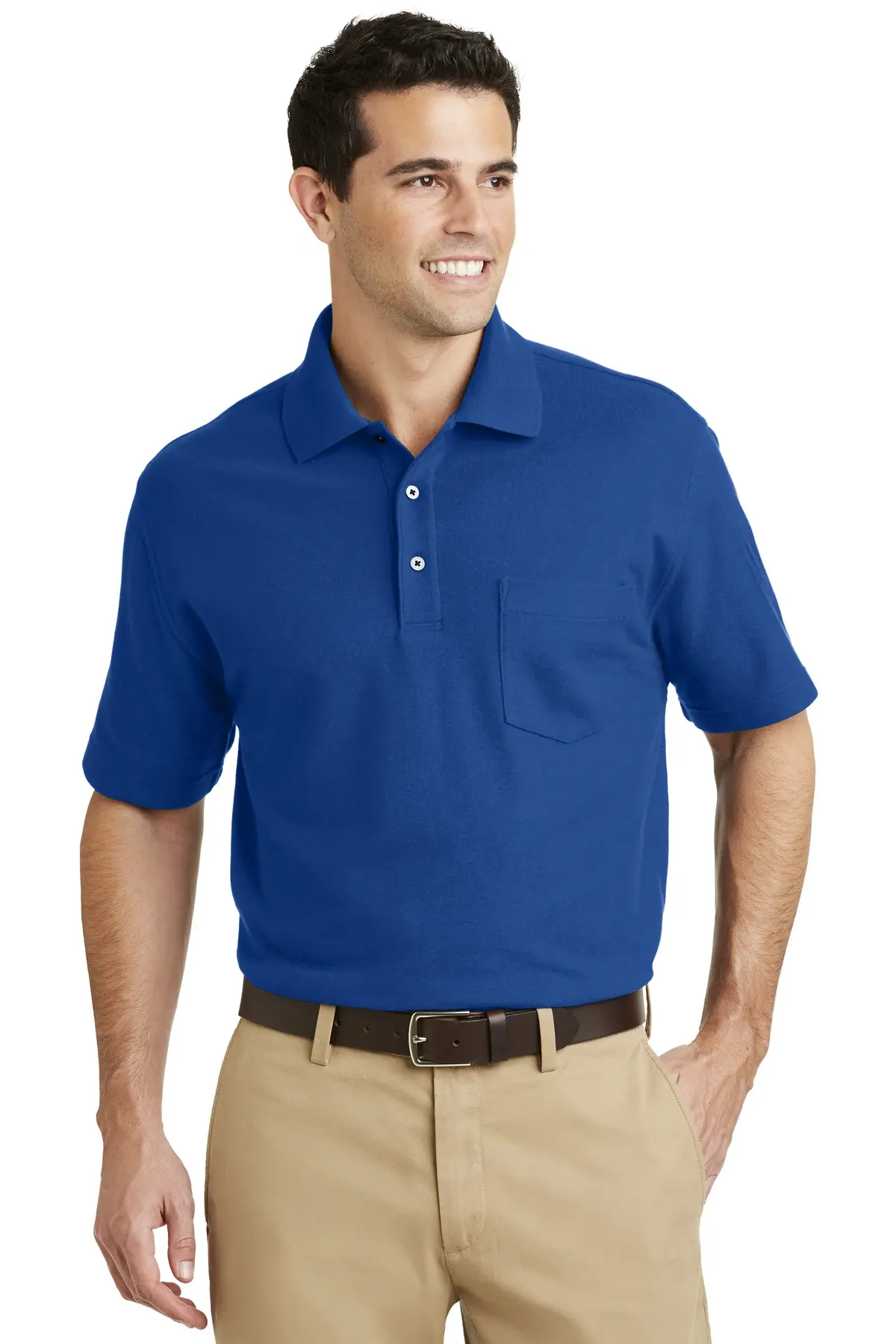 The Port Authority EZCotton™ Pique Pocket Polo combines timeless comfort with everyday practicality. Crafted from durable cotton pique, it offers breathability and softness. The anti-curl collar maintains a neat appearance. Fabric resists pilling, fading, wrinkling, and shrinking. A left chest pocket adds convenient storage. Decorative piping inside the neckband enhances style. Flat knit collar adds structure. Open hem sleeves provide comfort. Side vents improve fit. This polo is ideal for workwear requiring function and classic style.