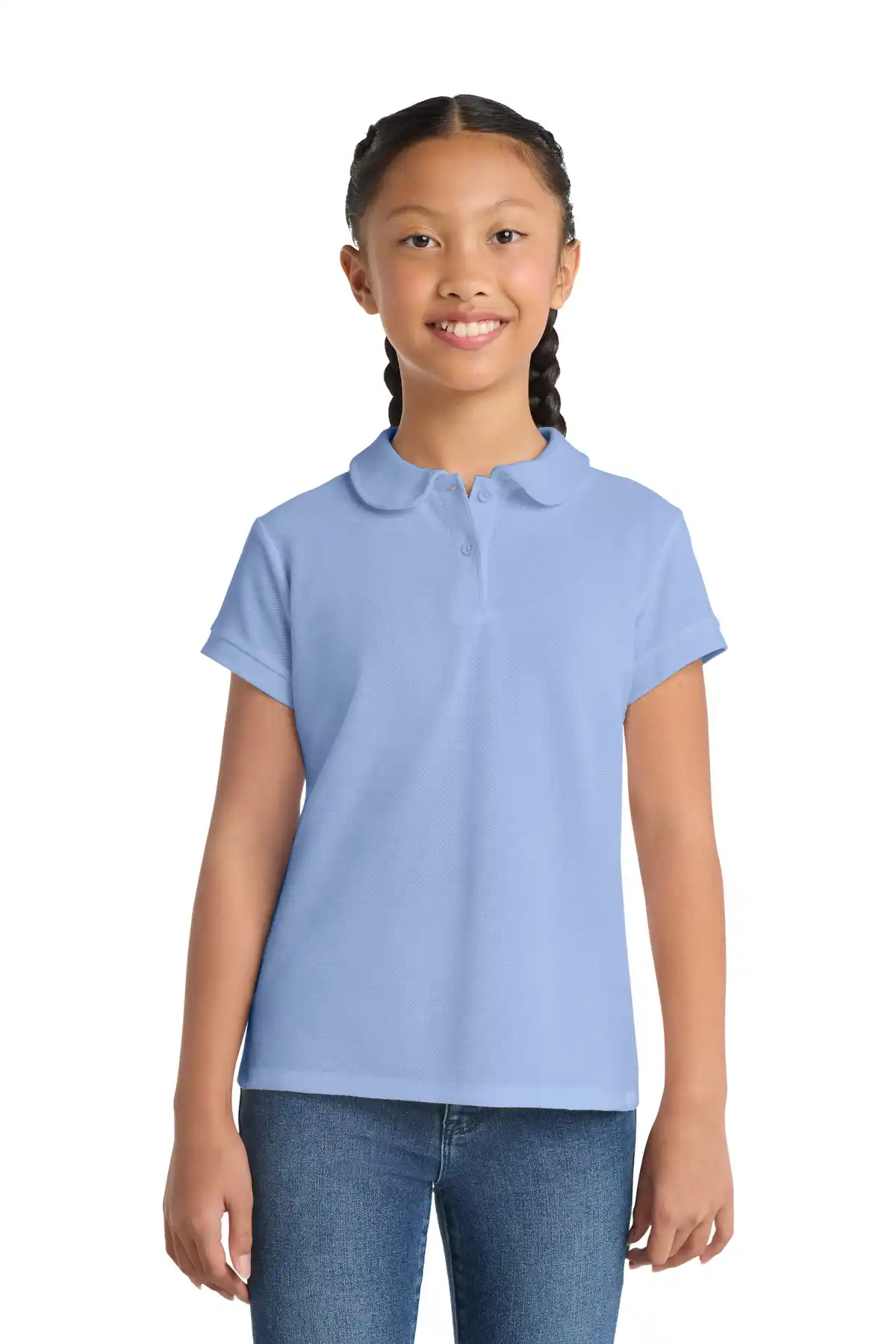 A school uniform essential, this Peter Pan Collar Polo offers a polished, professional look for girls while maintaining comfort and ease of care. Crafted from 5-ounce, 65/35 polyester/cotton pique, the fabric is soft, wrinkle- and shrink-resistant. The rounded Peter Pan collar adds a refined touch, complemented by a 2-button placket and flat knit cuffs. Ideal for classrooms, school events, and uniform programs, this polo balances traditional style with modern performance.