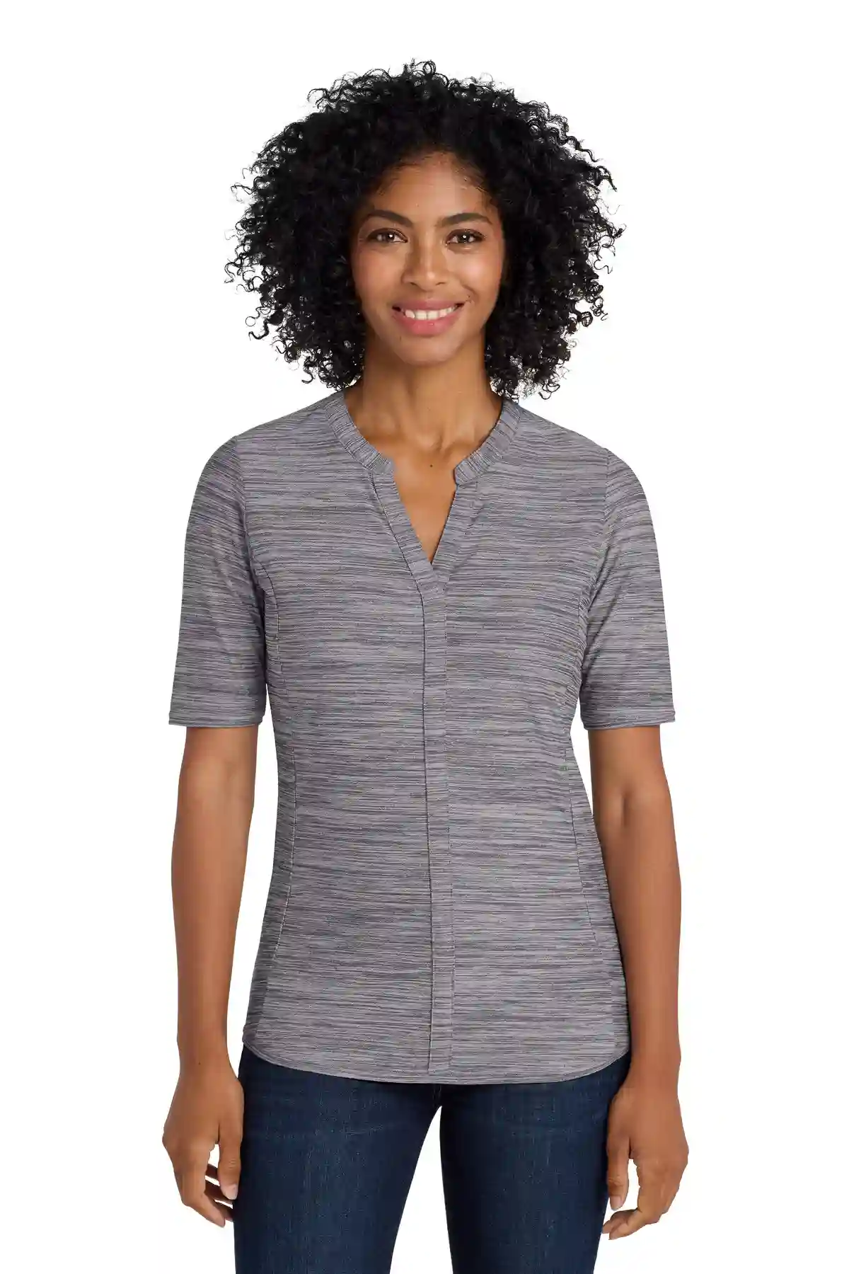 This elevated heathered top combines office-ready style with unrestricted stretch. Designed to move with you, it features moisture-wicking fabric for all-day comfort. The open neckline and center front placket detail add polished appeal, while front seaming and slightly longer sleeves enhance fit. A gently curved hem completes the sophisticated silhouette.