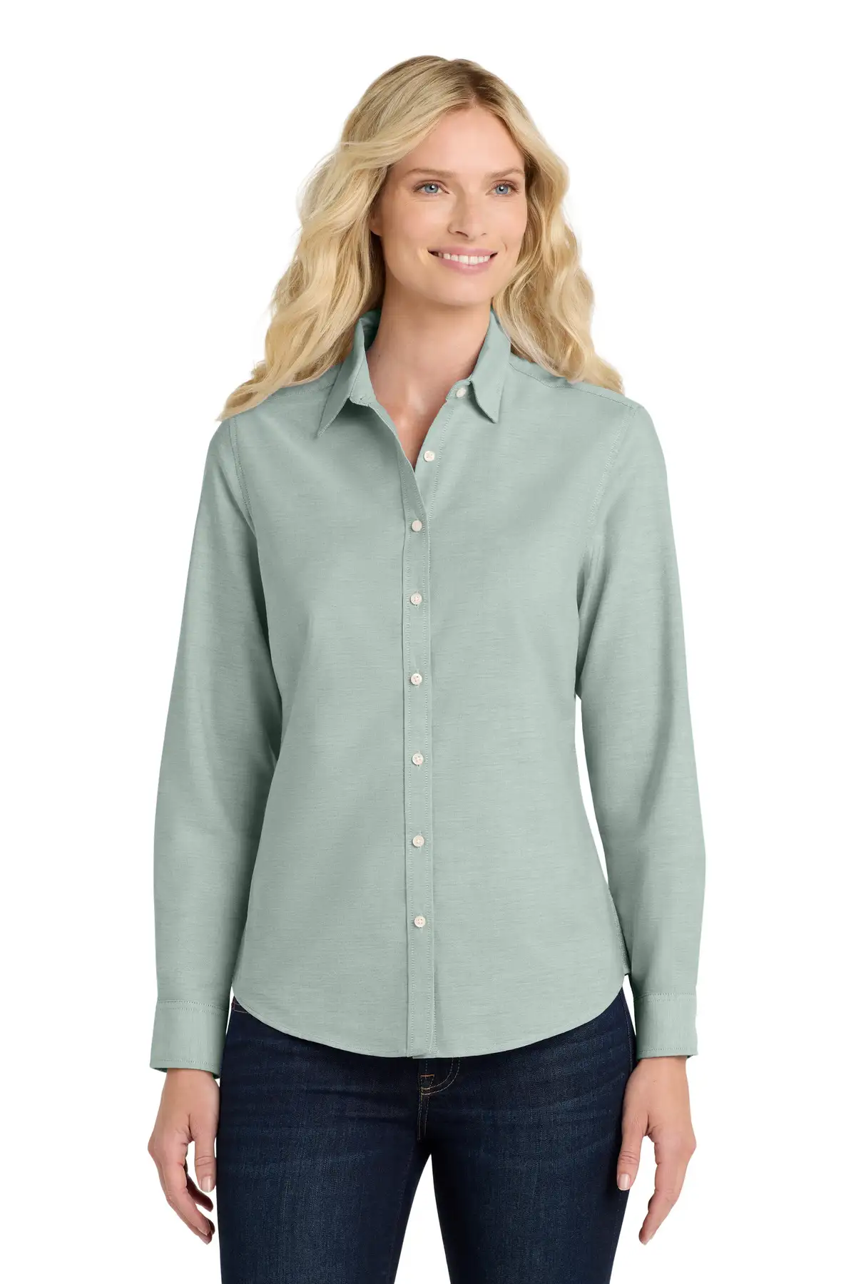 This SuperPro Oxford shirt delivers dependable performance for professional environments. The stain-release and wrinkle-resistant fabric keeps the shirt looking sharp all day. Soft hand feel ensures comfort during extended wear. Bust darts provide a tailored, feminine fit. Back shoulder pleats enhance ease of movement. Pearlized buttons elevate the overall finish. Rounded adjustable cuffs add versatility. Durable construction supports frequent laundering. This shirt is ideal for office and uniform use. It offers classic oxford styling with modern performance benefits.