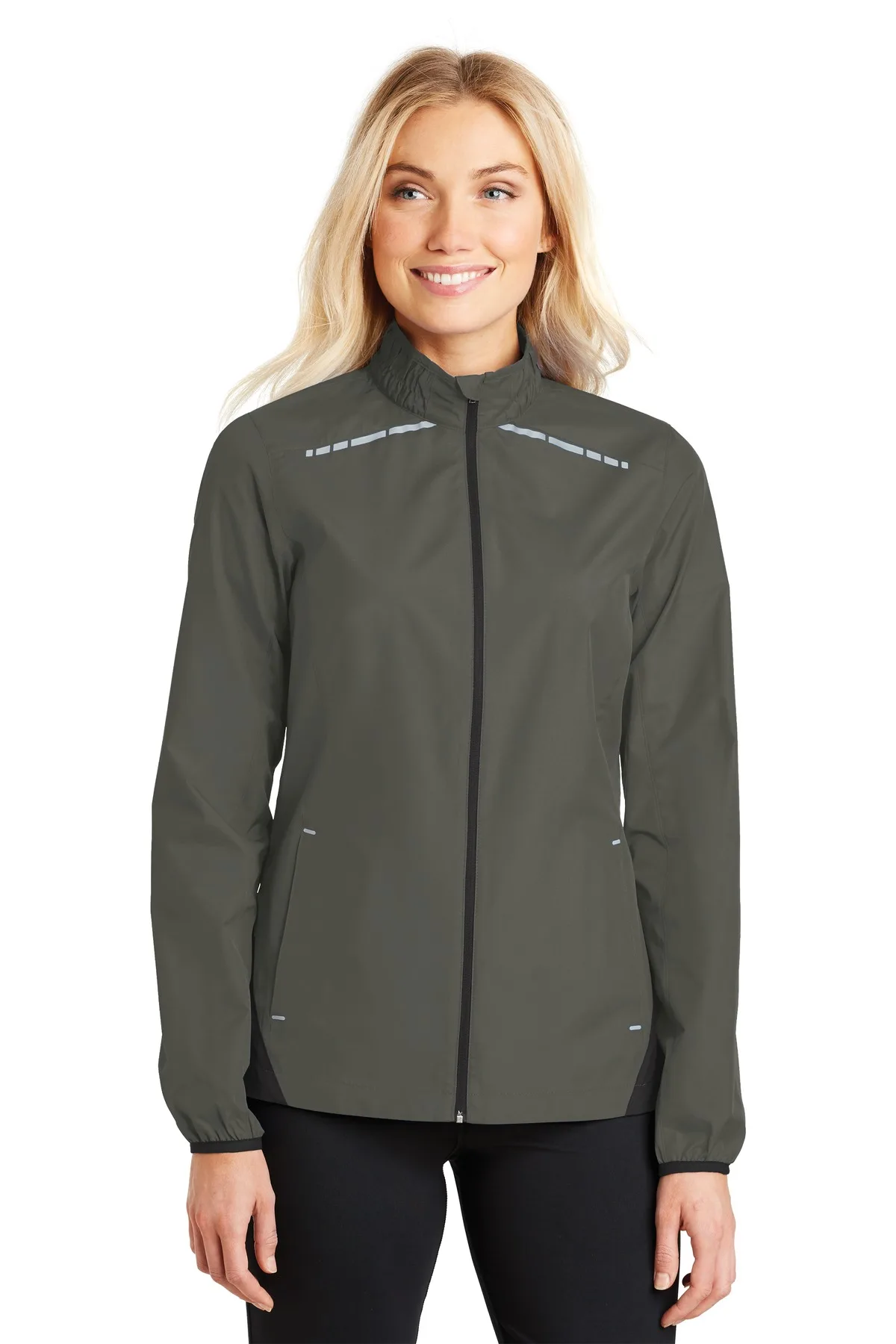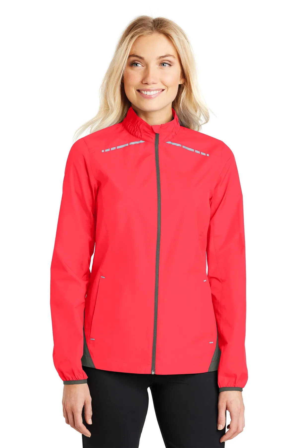 This Zephyr Reflective Hit Full-Zip Jacket blends lightweight performance with enhanced visibility. Reflective hits and colorblocking details add visual impact and safety awareness. The smooth, wind- and water-resistant shell provides everyday protection. An unlined design keeps the jacket light and flexible. Partial ruching at the collar adds subtle style. Elastic cuffs and hem help retain warmth. Open front pockets provide functional storage. Ideal for active or casual wear, this jacket delivers modern styling with practical performance.