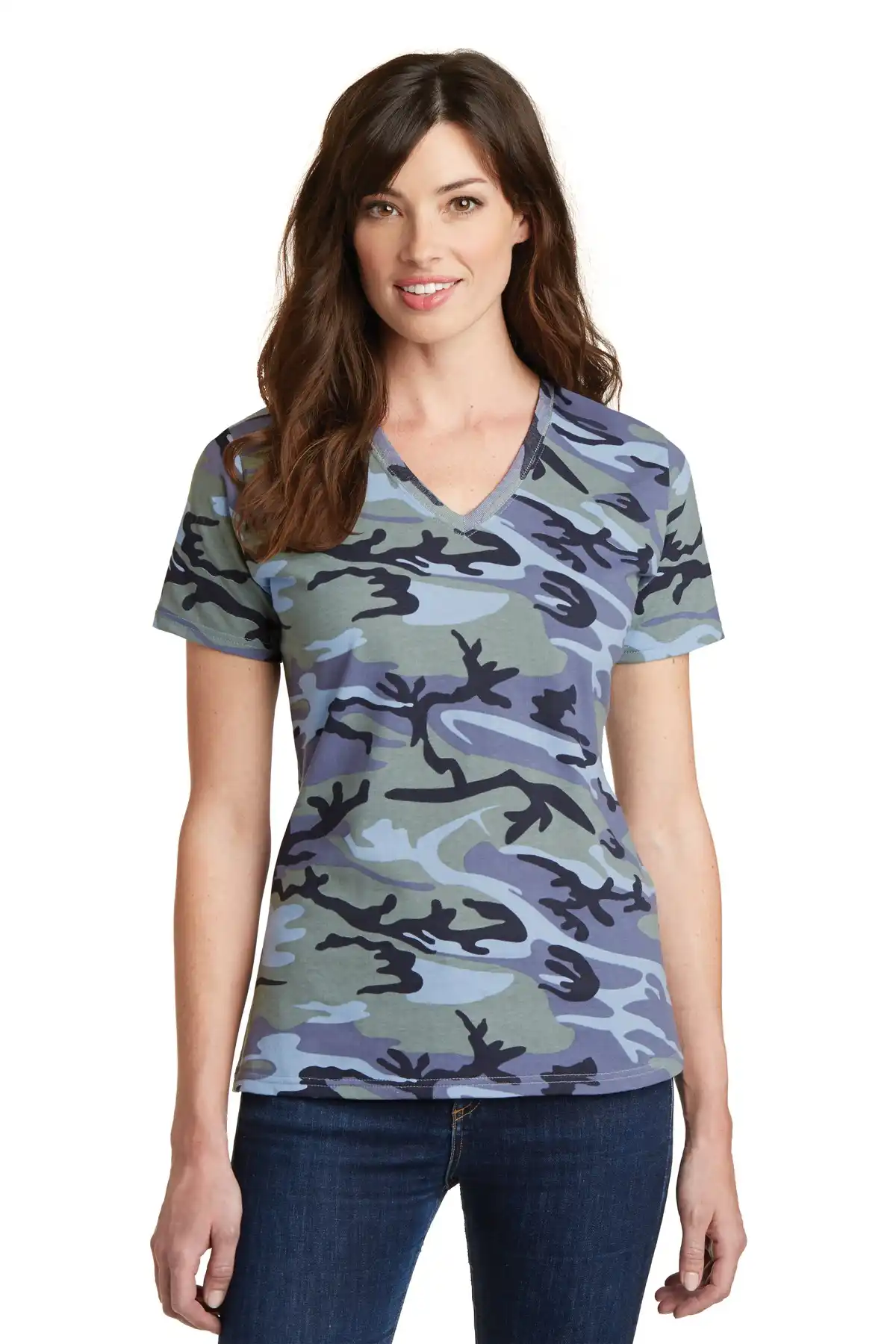 Step into style and confidence with the Port & Company® Ladies Core Cotton Camo V-Neck Tee, designed to make a bold statement while offering luxurious comfort. Crafted from 5.4-ounce, 100% soft cotton, this tee ensures a smooth, breathable feel against the skin, perfect for all-day wear. The pigment-dyed camo pattern adds a unique, fashionable edge that stands out while remaining versatile for casual, street, or outdoor-inspired looks. Each tee is side-seamed and contoured to create a flattering, feminine silhouette, providing a refined and tailored fit. The V-neck design enhances layering possibilities, pairing effortlessly with jackets, hoodies, or cardigans. A removable tag ensures irritation-free comfort, making it ideal for sensitive skin. Durable construction guarantees that this tee maintains its shape and vibrant color after repeated washes. The pigment-dyeing process infuses each garment with a slightly unique variation, ensuring every piece has its own distinctive character.