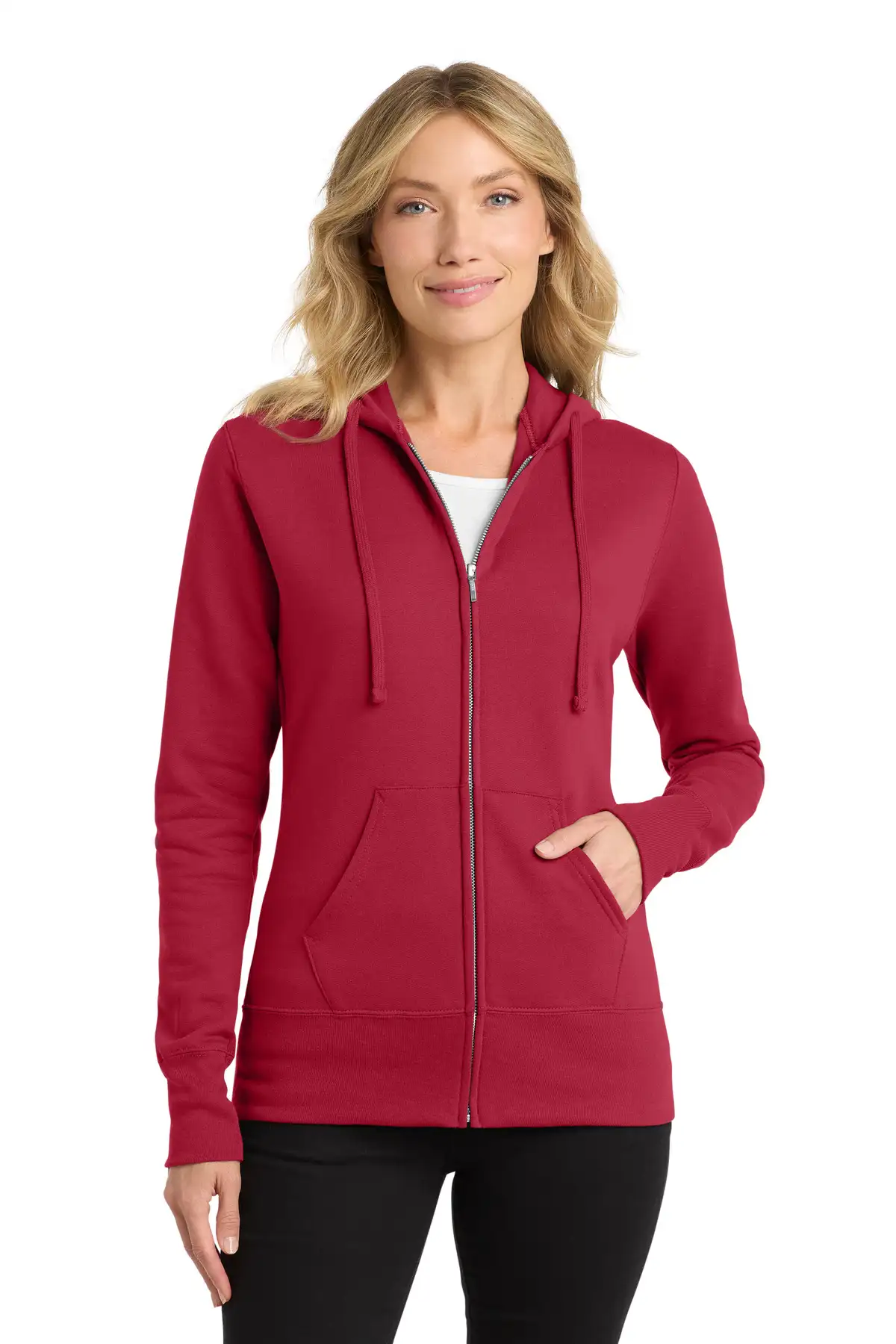 This full-zip hooded sweatshirt offers the perfect balance of comfort and functionality for women seeking style and warmth. Crafted from 7.8-ounce, 50/50 cotton/poly fleece with air jet yarn for exceptional softness, it features a jersey-lined hood with dyed-to-match drawcords for added comfort. The contoured, side-seamed body provides a flattering feminine fit. A durable YKK metal zipper ensures smooth operation, while front pockets offer practicality for carrying small essentials. Ideal for layering or wearing on its own, this versatile sweatshirt is perfect for casual outings, outdoor activities, or relaxing at home. Lightweight yet warm, it resists pilling and maintains its softness over time. Easy-care fabric makes it suitable for frequent washing.
