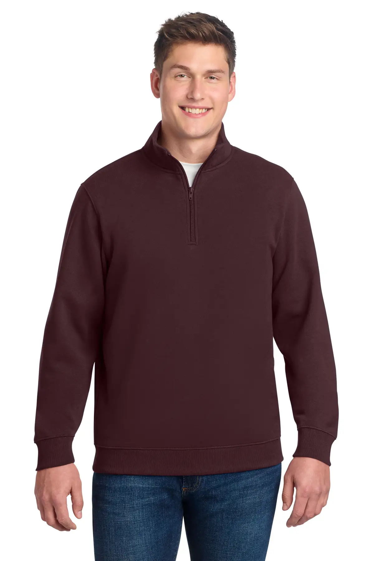 Built for durability and ease of movement, the 1/4-Zip Sweatshirt features 9-ounce, 65/35 ring-spun combed cotton/poly fleece. Moisture-resistant and colorfast, it maintains shape and appearance after repeated use. Twill-taped neck ensures comfort. 2x2 rib knit cuffs and waistband with spandex provide stretch and fit retention. Classic quarter-zip design allows layering flexibility. Ideal for warm-ups, cool-downs, or casual layering.