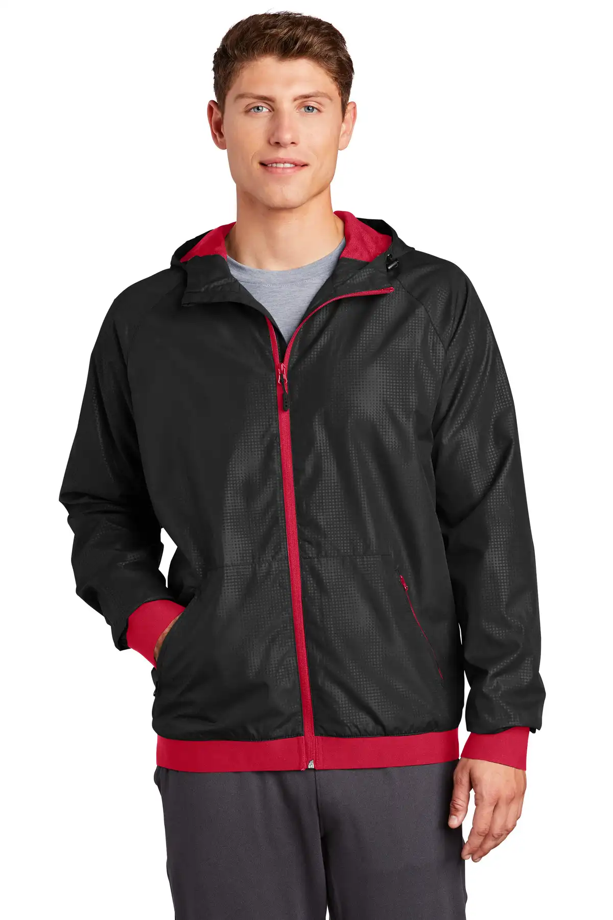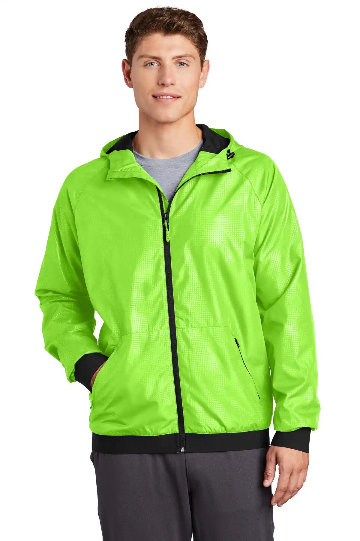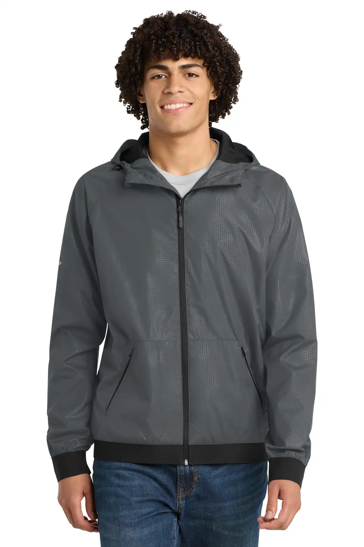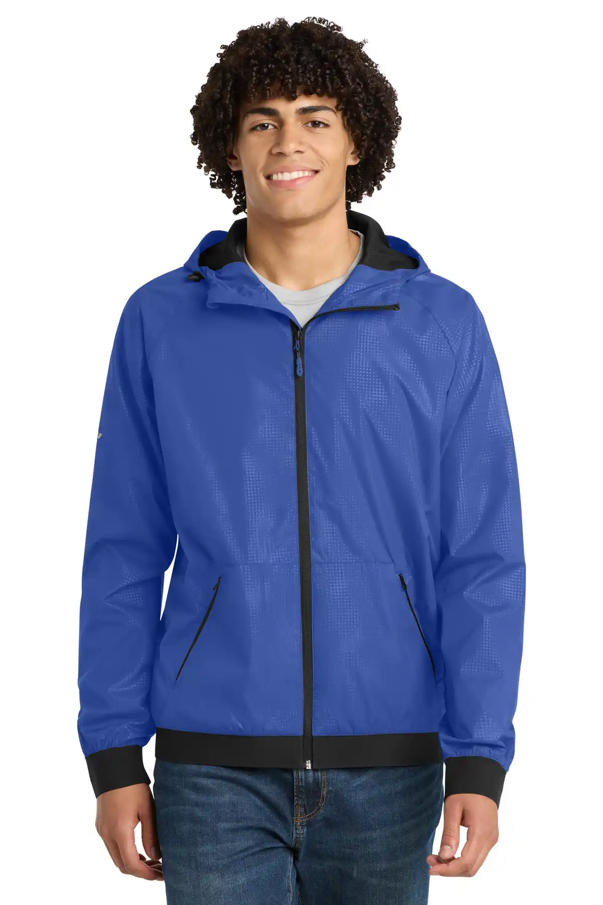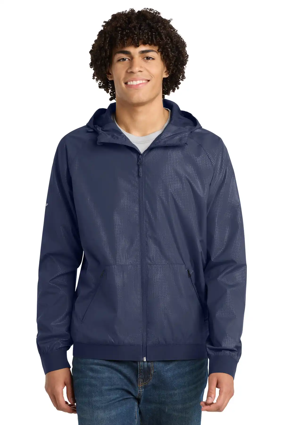 The Embossed Hooded Wind Jacket offers wind- and water-resistance with a modern embossed geometric design. Three-panel hood with drawcords ensures adjustable protection, and reflective accents enhance visibility in low-light conditions. Raglan sleeves and reverse coil zipper allow comfort and ease of movement. A decoration access pocket makes it easy to personalize. Mesh lining in body and hood enhances breathability, while elastic trim at cuffs and hem ensures a secure fit.