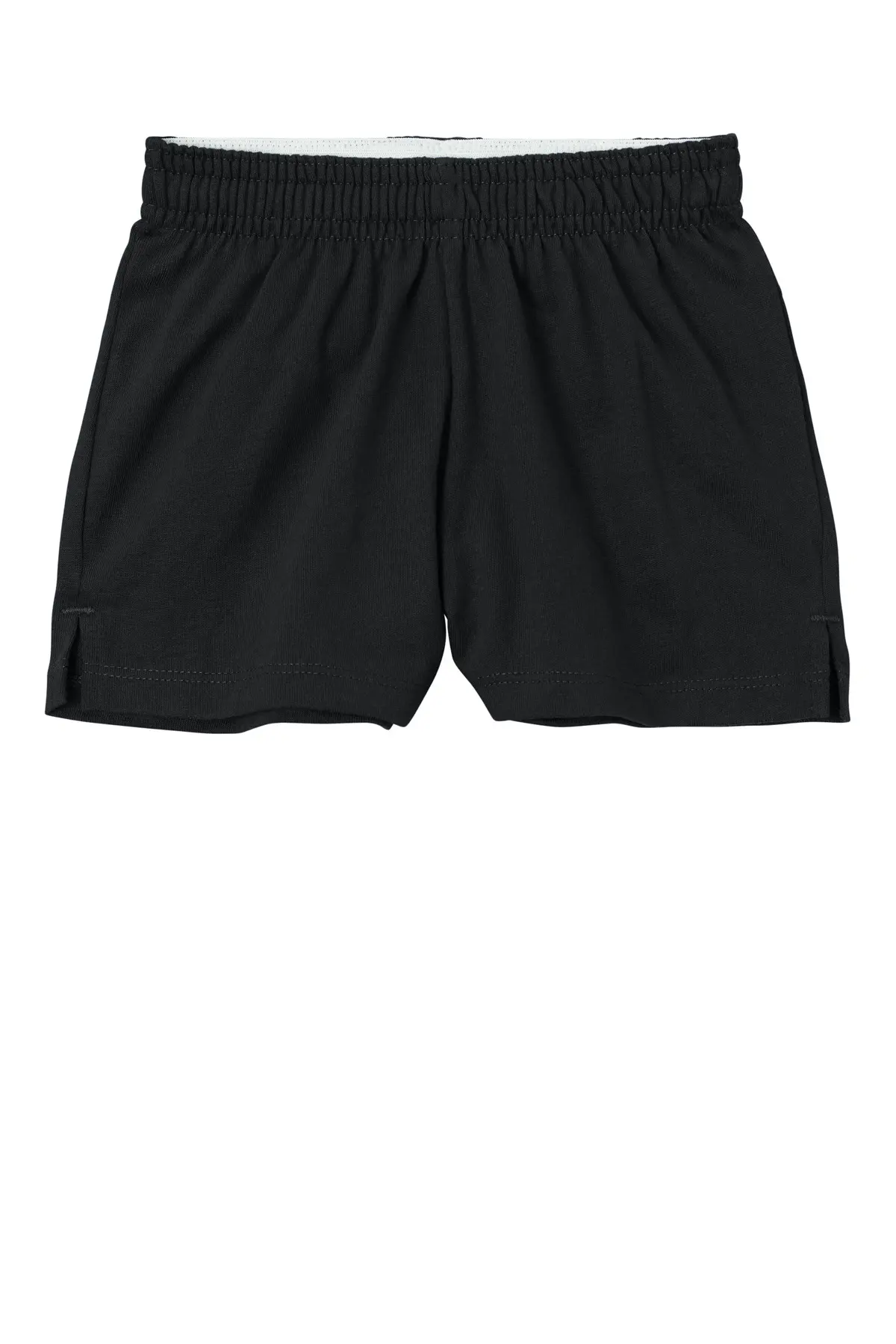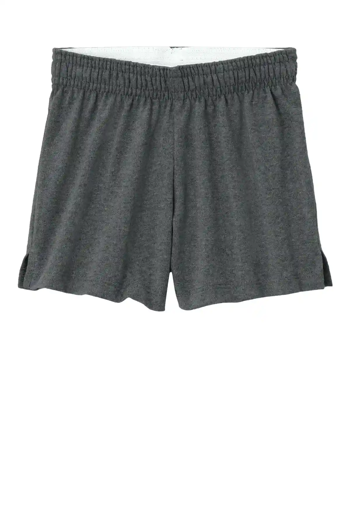 Designed for cheer, dance, and active movement, the Girls Jersey Knit Squad Short offers stretch comfort with structured fit. Made from 6.2-ounce 60/40 cotton/poly jersey knit, it provides softness with durability. The white exposed inner elastic waistband can be worn rolled or unrolled for styling flexibility. A 2.5-inch inseam and 1-inch side vents enhance mobility while maintaining coverage. The form-fitting silhouette supports active performance.
