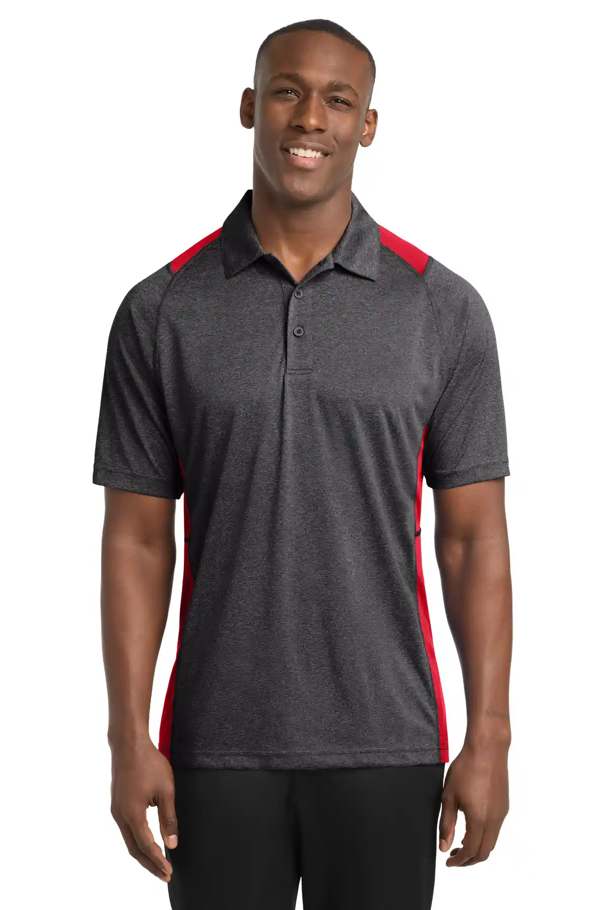 Color pops at shoulders and sides for a modern, sporty aesthetic. Lightweight polyester jersey with interlock panels ensures moisture-wicking and snag resistance. Raglan, open-hem sleeves and double-needle stitching enhance comfort and durability, making it a versatile team or performance polo.