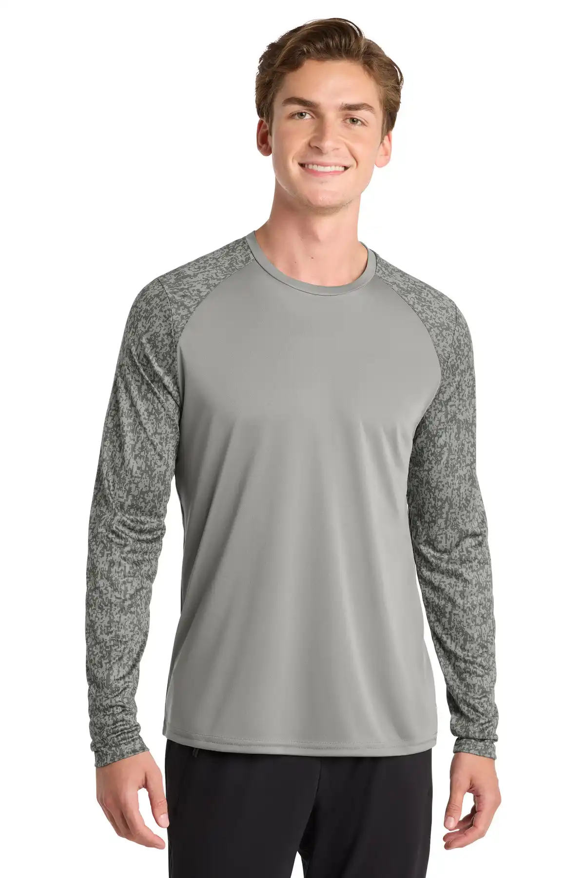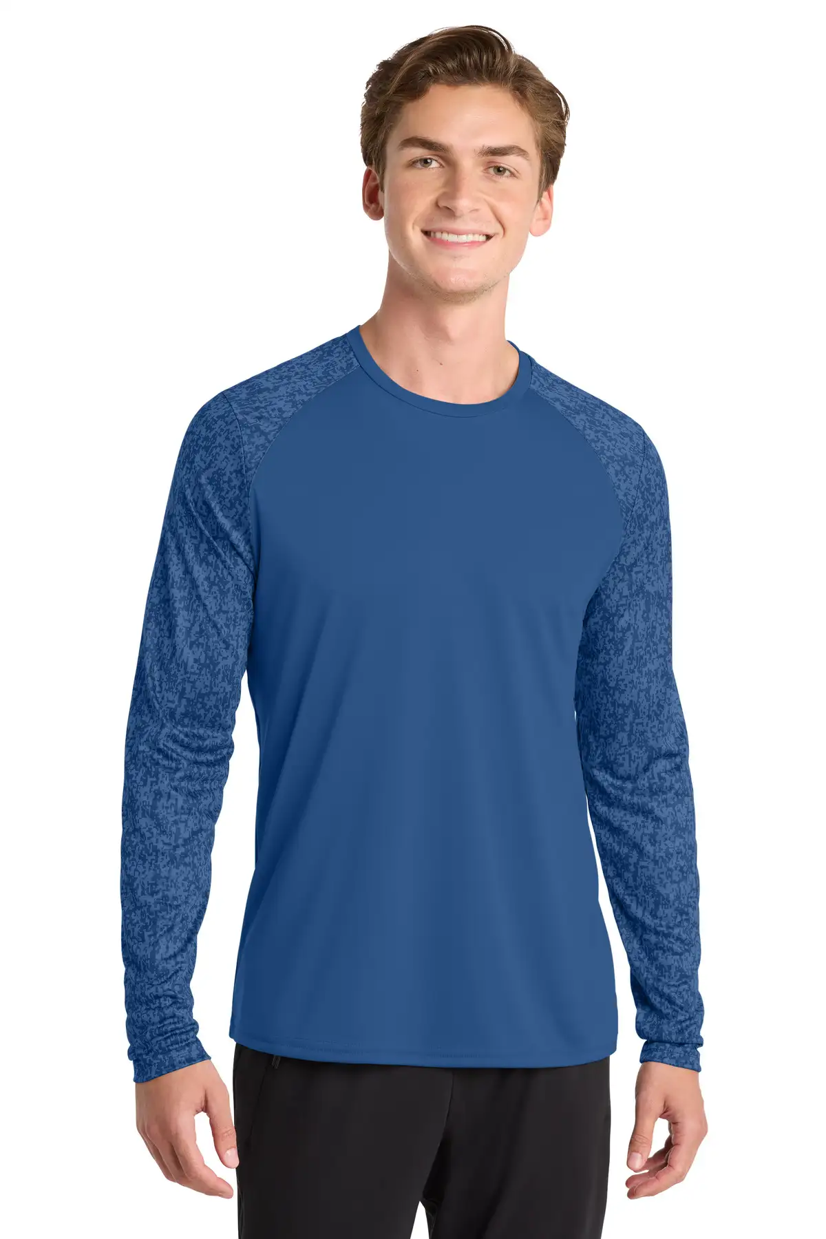 Full-length sleeve tee with sublimated digi camo print for a modern, athletic look. Moisture-wicking, breathable polyester keeps you dry and comfortable. Digi camo print extends to sleeves for consistent design. Removable tag enhances comfort and allows relabeling. Lightweight construction ideal for layering. Set-in sleeves ensure full mobility.