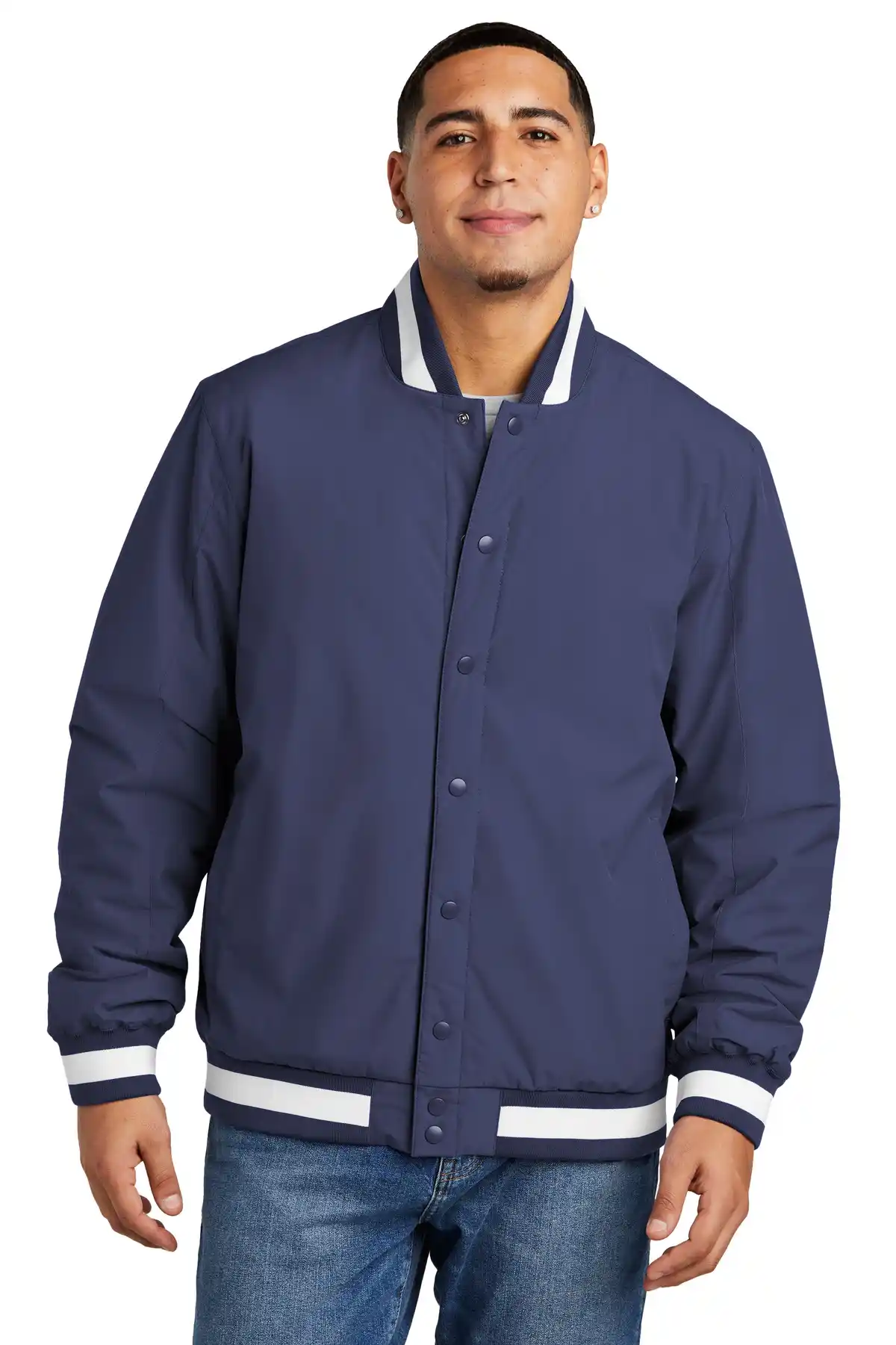 This Insulated Varsity Jacket combines a retro-inspired aesthetic with functional weather protection. Constructed with water-resistant polyester and 2.4-ounce polyfill in the body and 1.8-ounce in sleeves, it offers warmth while resisting the elements. Tag-free label and dyed-to-match metal snap closures ensure comfort and style. Features include front welt pockets, locker loop, decoration access pocket, and 1x1 striped rib knit at collar, cuffs, and hem for a classic varsity look.