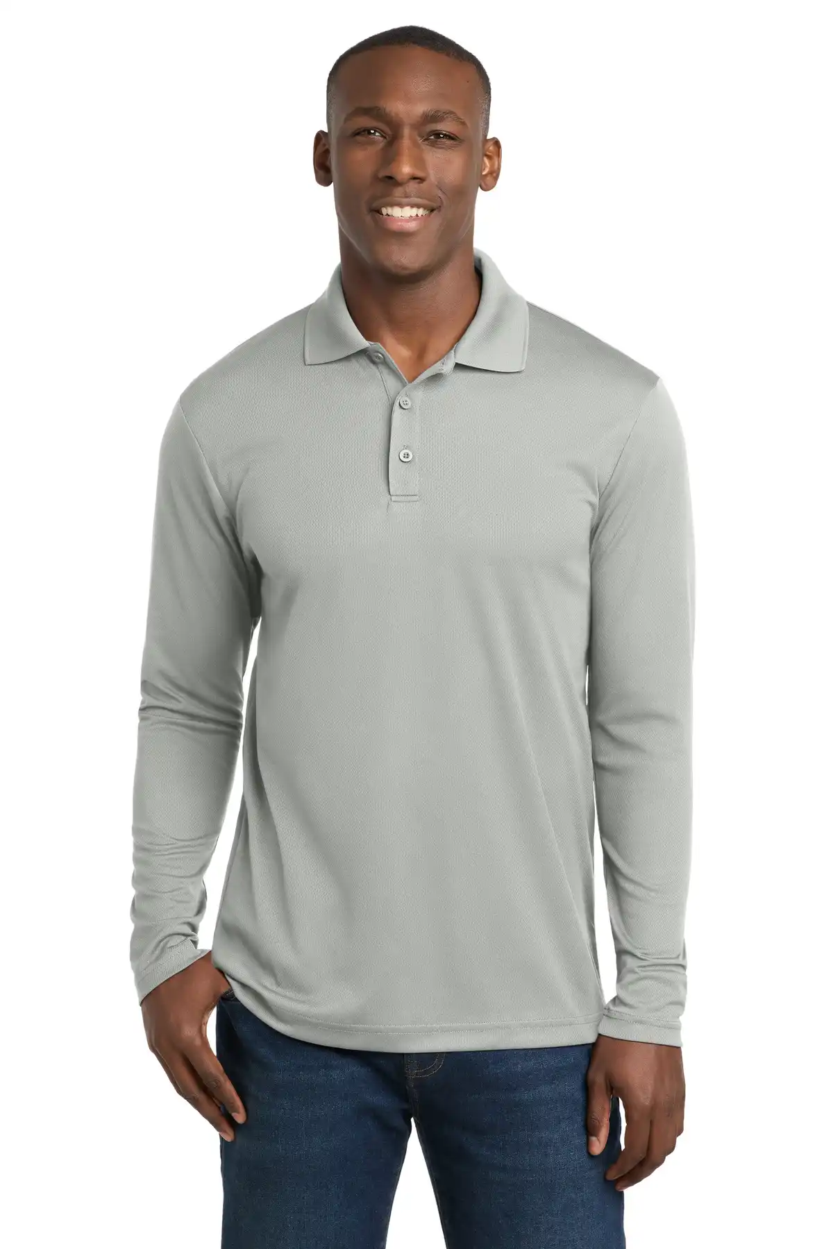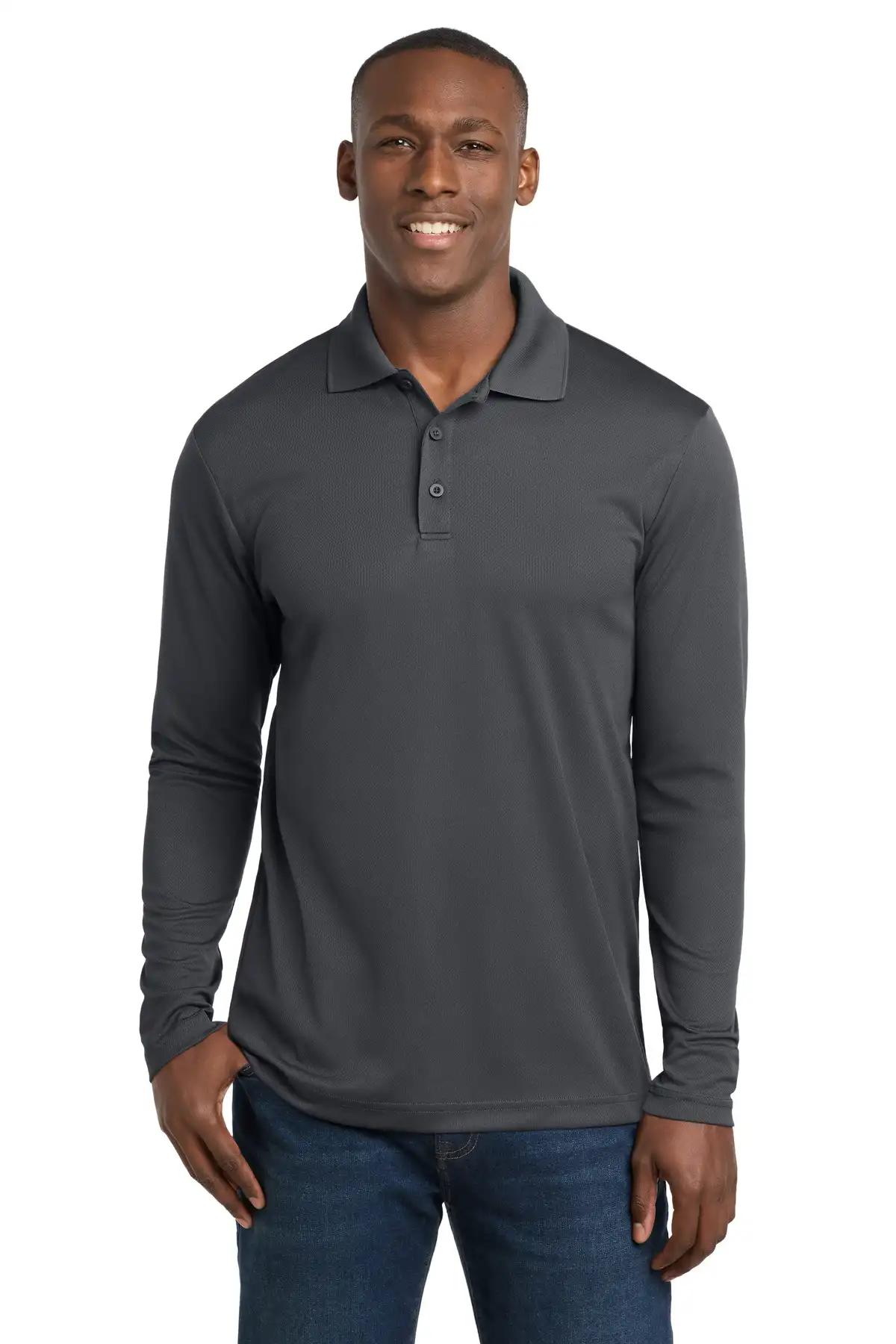 Long-sleeve variant of the RacerMesh polo provides full-arm coverage with the same ultra-breathable mesh construction. PosiCharge technology locks in colors for lasting vibrancy. Moisture-wicking 3.8-ounce polyester keeps wearers cool and dry. Flat-knit collar with taped neck ensures professional styling. Three-button placket with dyed-to-match buttons and set-in open hem sleeves complete this performance-ready long sleeve polo.