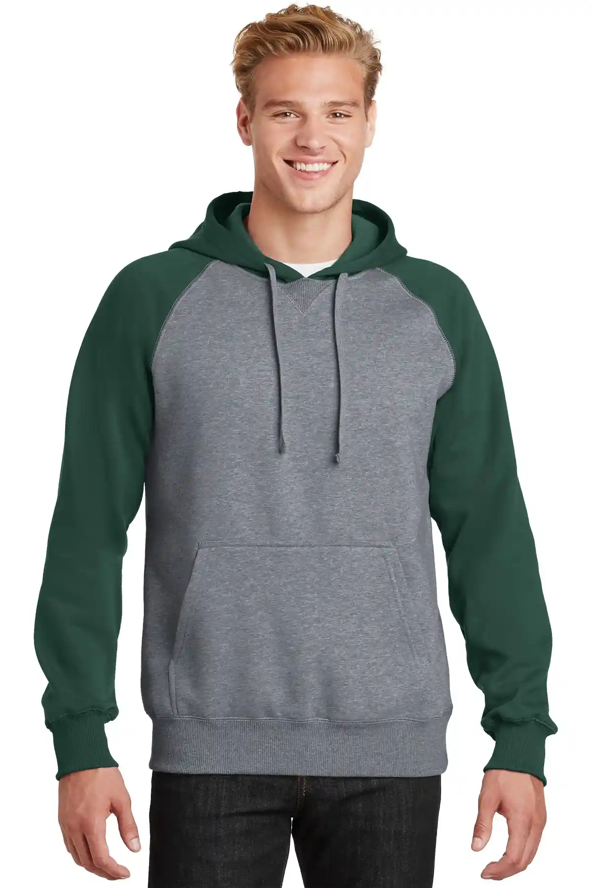 Bold colorblocking on the hood and raglan sleeves gives the Raglan Colorblock Pullover Hooded Sweatshirt dynamic sport appeal. Constructed from 9-ounce, 65/35 ring-spun combed cotton/poly fleece, it resists shrinkage and fading. The three-panel hood with dyed-to-match drawcord ensures adjustable coverage. Twill-taped neck and rib knit V-patch add durability and style. 2x2 rib knit cuffs and hem with spandex maintain shape. A front pouch pocket enhances functionality for active or casual wear.