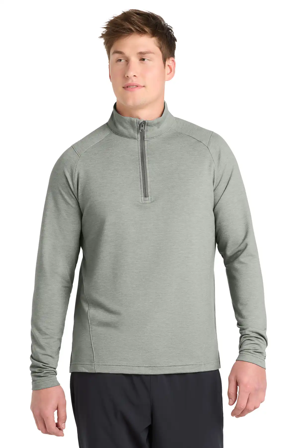 Quarter-zip fleece with lightweight stretch and moisture management. Sport-Wick fabric with cotton hand feels soft and breathable. Cadet collar ensures coverage, and self-fabric cuffs/hem maintain clean style. Tear-away removable label adds comfort. Perfect as a layering piece or for active wear in cooler conditions.