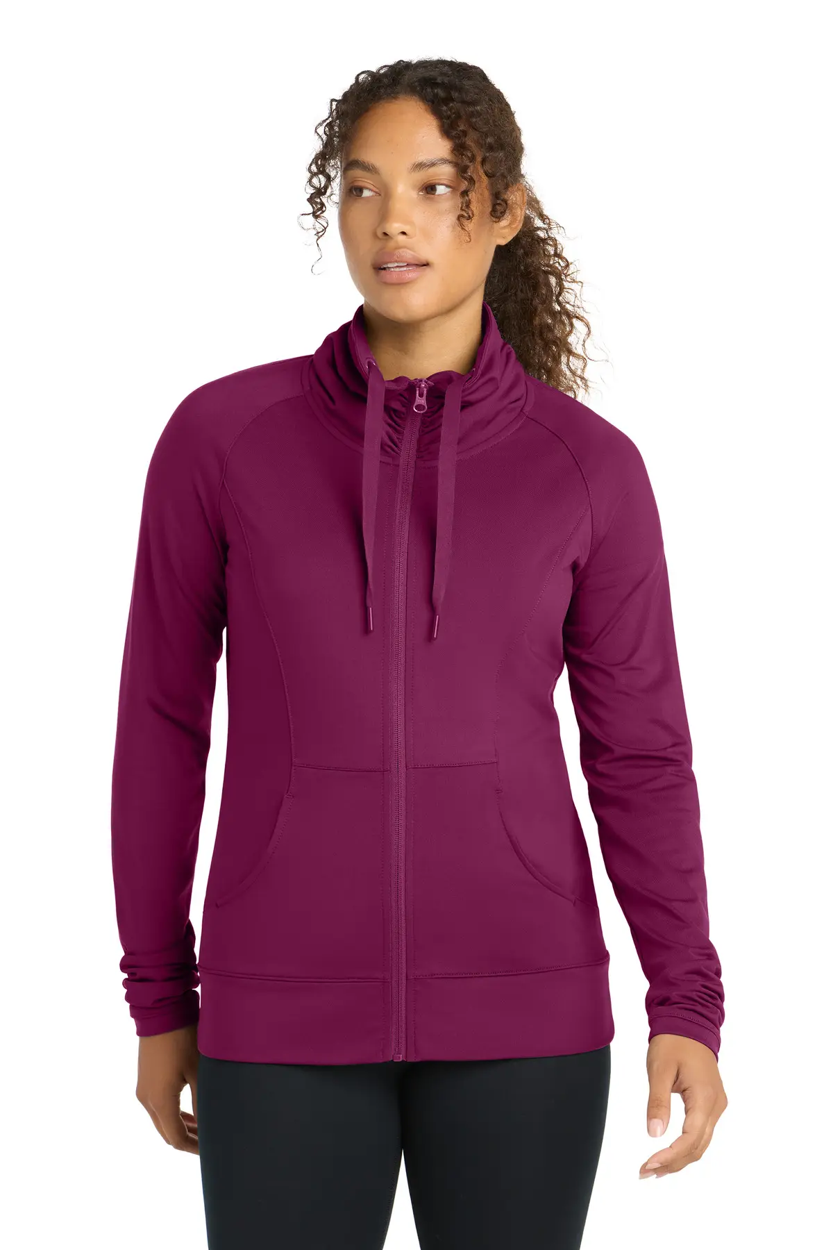 This Sport-Wick Stretch Full-Zip Jacket delivers advanced moisture management in a sleek, athletic silhouette. The soft-brushed poly/spandex fabric provides lightweight warmth and unrestricted flexibility. A distinctive zip-through cowl collar with ruching adds refined styling while enhancing comfort. Raglan sleeves ensure natural movement during training or travel. Front pouch pockets provide practical storage without compromising the clean design. Built for performance and polished appearance, this jacket transitions seamlessly from gym to everyday wear.