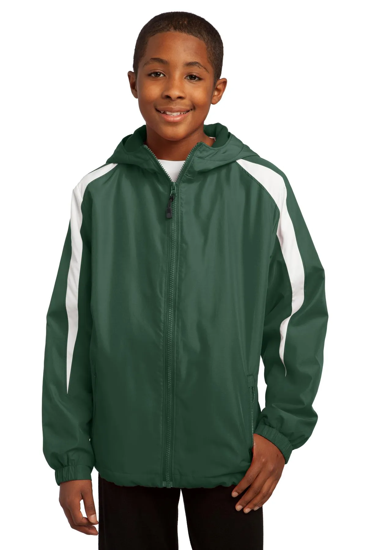 This versatile jacket shields youth from wind and rain while providing warmth with a microfleece lining. Athletic colorblocking delivers style on the field or sidelines. Polyester shell is wind- and water-resistant, complemented by 8.8-ounce microfleece lining and 3-ounce polyester fill in sleeves. Exposed molded zipper enhances durability, while half-elastic, half self-fabric cuffs secure a comfortable fit. Front zippered pockets provide storage, and decoration access pocket allows custom logos. Lightweight enough for layering yet sturdy for outdoor play.