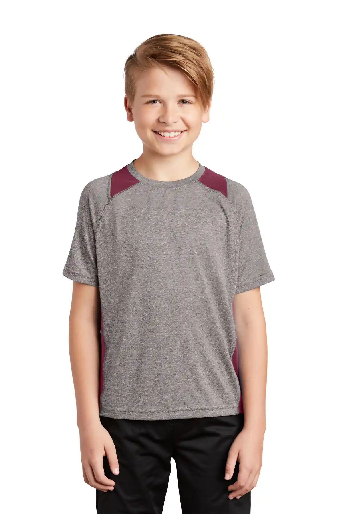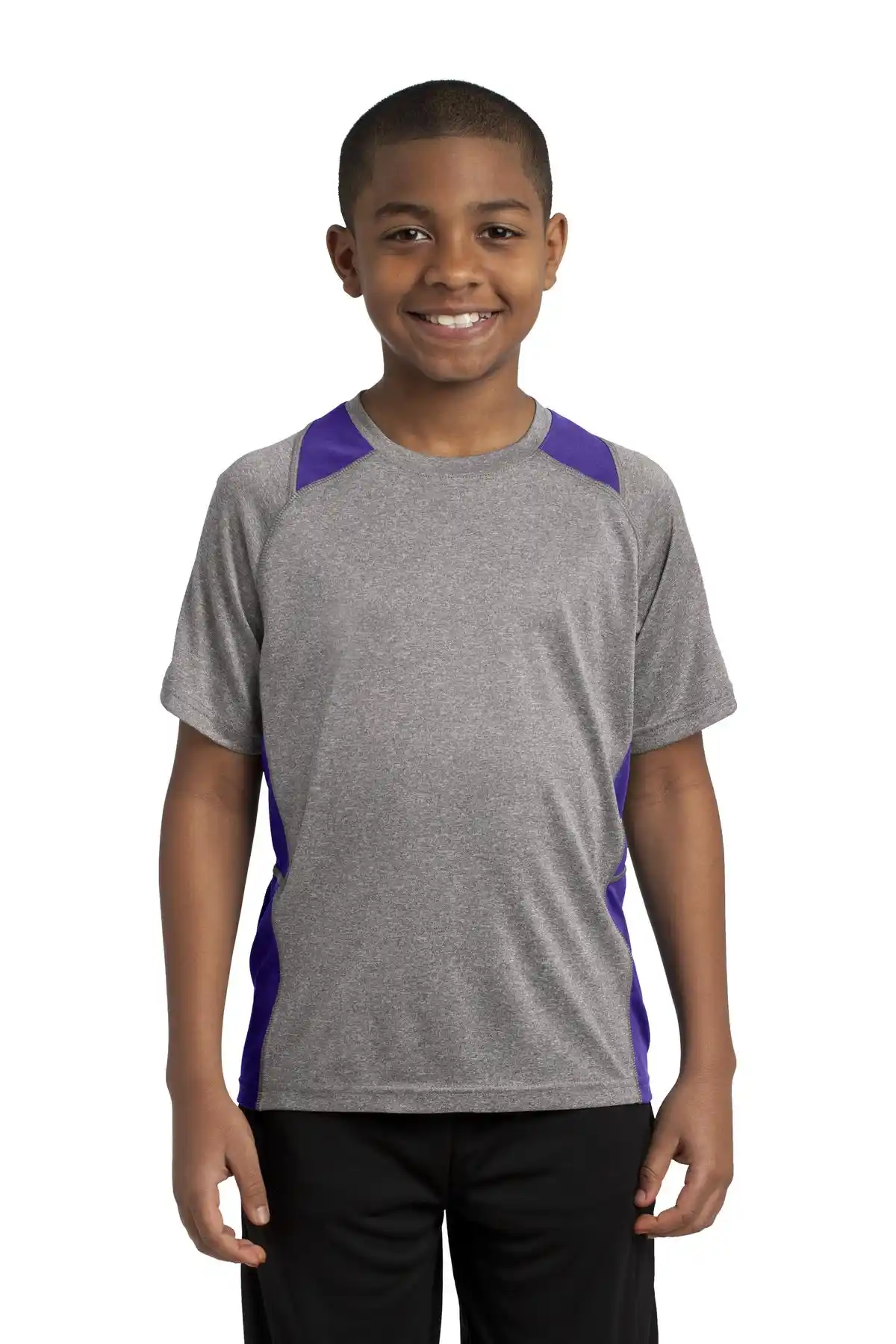 The Youth Heather Colorblock Contender Tee provides a modern athletic look with color accents at the neck and sides while offering exceptional breathability and moisture-wicking performance. Constructed from 3.8-ounce, 100% polyester jersey with matching 3.8-ounce polyester interlock panels, it is lightweight, snag-resistant, and ideal for active youth. Its raglan sleeves allow full range of motion.