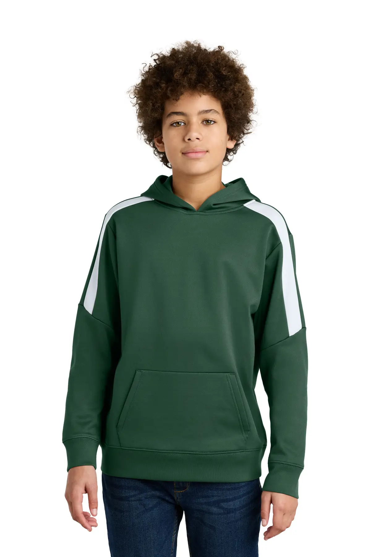 The Youth Sport-Wick Fleece United Pullover Hoodie provides versatile performance both on and off the field. Constructed from 5.5-ounce, 100% polyester fleece, it features moisture-wicking and anti-static technology for consistent comfort. The two-panel hood maintains streamlined structure while eliminating drawcords for youth safety standards. Designed for athletic movement, it includes self-fabric cuffs and hem to maintain clean shaping over time.