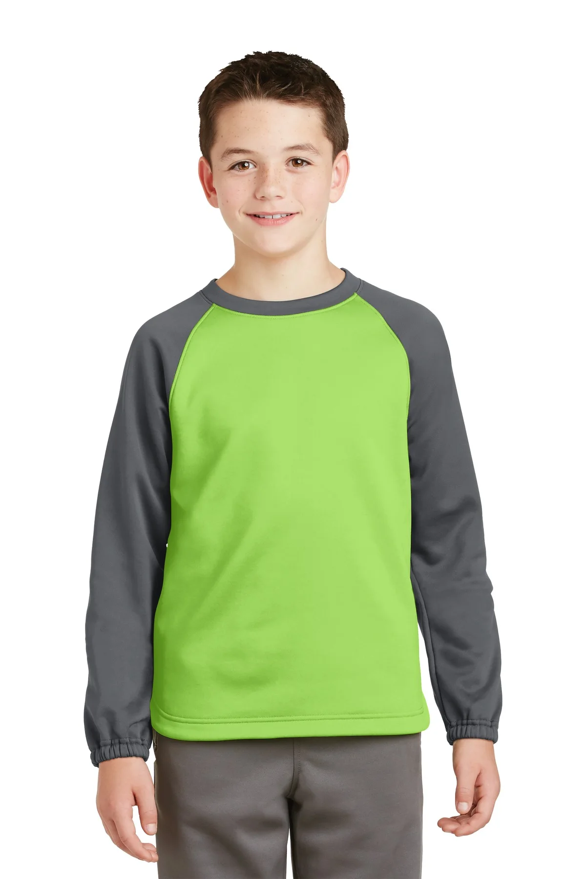Inspired by classic baseball styling, this Youth Sport-Wick Raglan Colorblock Fleece Crewneck combines traditional athletic design with moisture-wicking and anti-static functionality. Constructed from 100% polyester fleece, it provides lightweight warmth suitable for warm-ups and active sports. Raglan sleeves enhance range of motion, reducing shoulder restriction during play. Elastic sleeve cuffs allow easy adjustment and remain securely positioned during activity. The scalloped hem adds subtle shaping and visual distinction.
