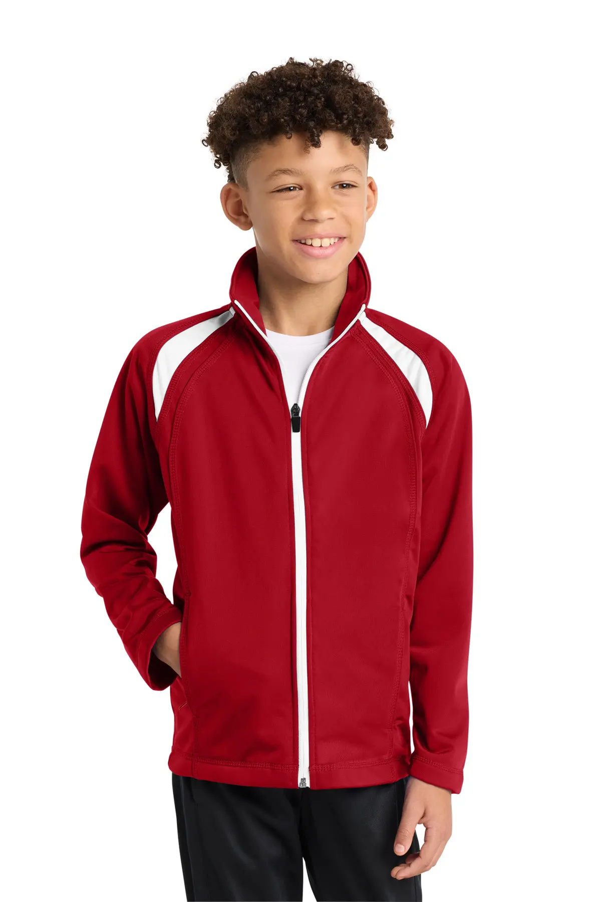 Designed for active youth, this track jacket features 100% polyester tricot with soft-brushed backing for comfort. Relaxed fit allows full mobility during warm-ups, training, or competition. Raglan sleeves enhance arm movement, while cadet collar adds classic style. Reverse coil zipper provides smooth closure. Side zippered pockets secure small essentials. Flatlock stitching throughout ensures durability, and moisture management keeps athletes comfortable. Ideal for coordinating with matching tricot pants for complete team apparel.