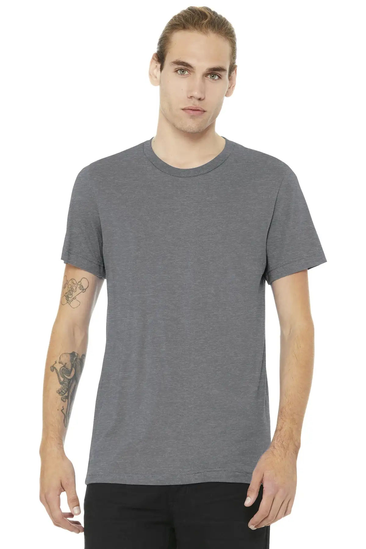 Athletic Heather / Black Heather: 4.2 oz, 90/10 Airlume combed and ring-spun cotton/polyester, 32 singles