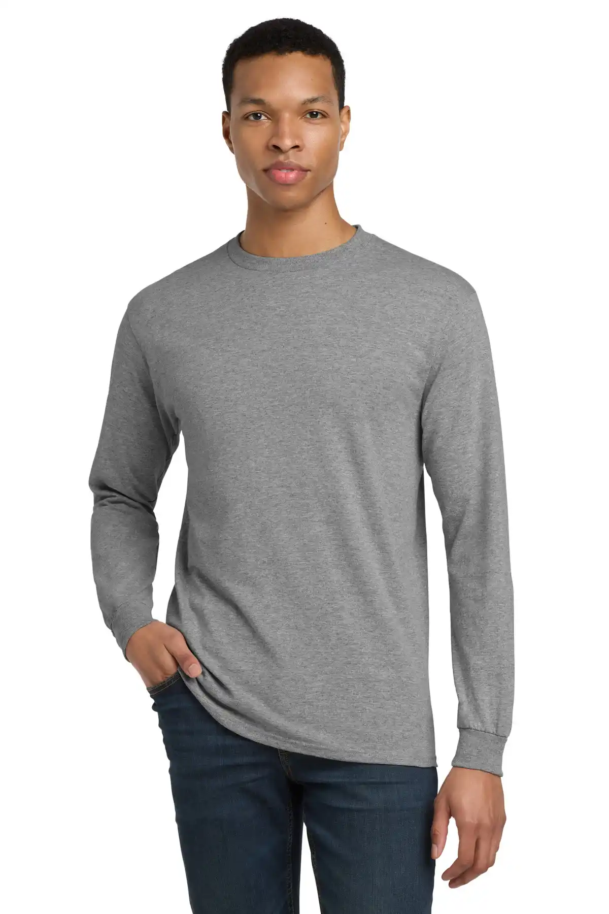 Crafted for all-day performance, this 5.5-ounce long sleeve tee blends 50/50 cotton/poly for moisture-wicking comfort and durability. Non-topstitched classic width rib collar, taped neck, and rib knit cuffs provide a polished fit. Seamless body ensures flexibility, making it perfect for layering or standalone wear.