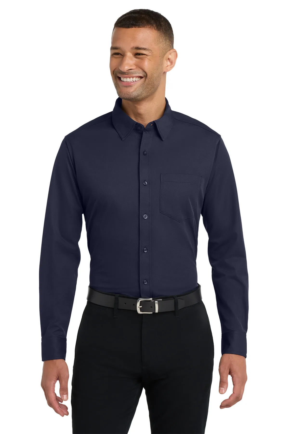 The Port Authority Dimension Knit Dress Shirt blends the comfort of a knit with the crisp appearance of a woven shirt. Designed for modern professionals and commuters, this shirt offers moisture-wicking performance to keep you dry throughout the day. The micropique polyester tricot fabric provides stretch and ease of movement without sacrificing structure. A versatile collar can be worn open for a relaxed look or buttoned down for a more formal appearance. The lightweight construction ensures breathability and comfort during long hours. Dyed-to-match buttons maintain a clean, professional finish. A left chest pocket adds functional detail. Rounded adjustable cuffs allow for a customized fit. This shirt is ideal for office environments where comfort and polish are equally important.