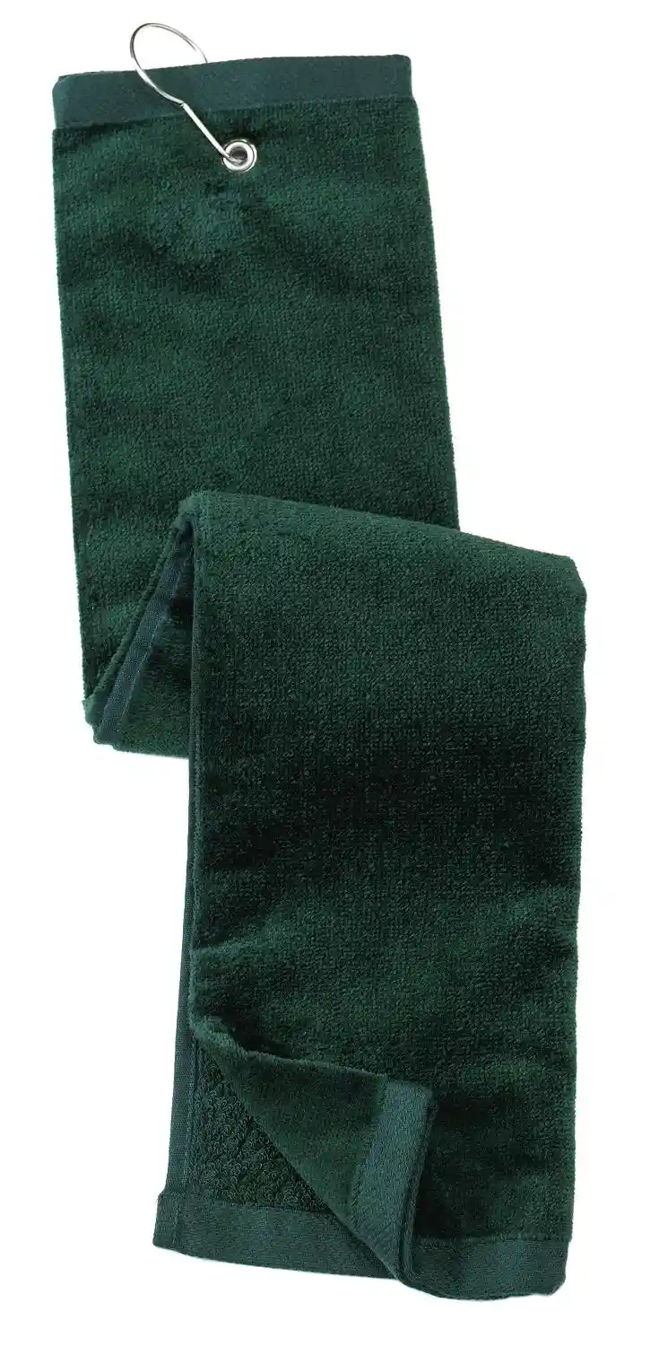 The Grommeted Tri-Fold Golf Towel is an essential companion for golfers. Made of 100% cotton terry velour, it is highly absorbent and fully hemmed. A grommet and hook allow easy attachment to golf bags for convenience on the course.