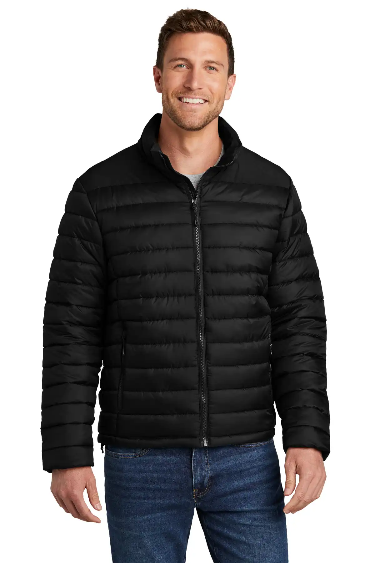 The Port Authority® Horizon Puffy Jacket delivers modern style paired with lightweight warmth. Designed with horizontal baffles and insulation that mimics down feathers, this jacket provides effective heat retention without excess bulk. A water-resistant finish helps repel light rain, while a slight sheen enhances its contemporary look. Ideal for everyday wear, this jacket balances comfort, warmth, and style.