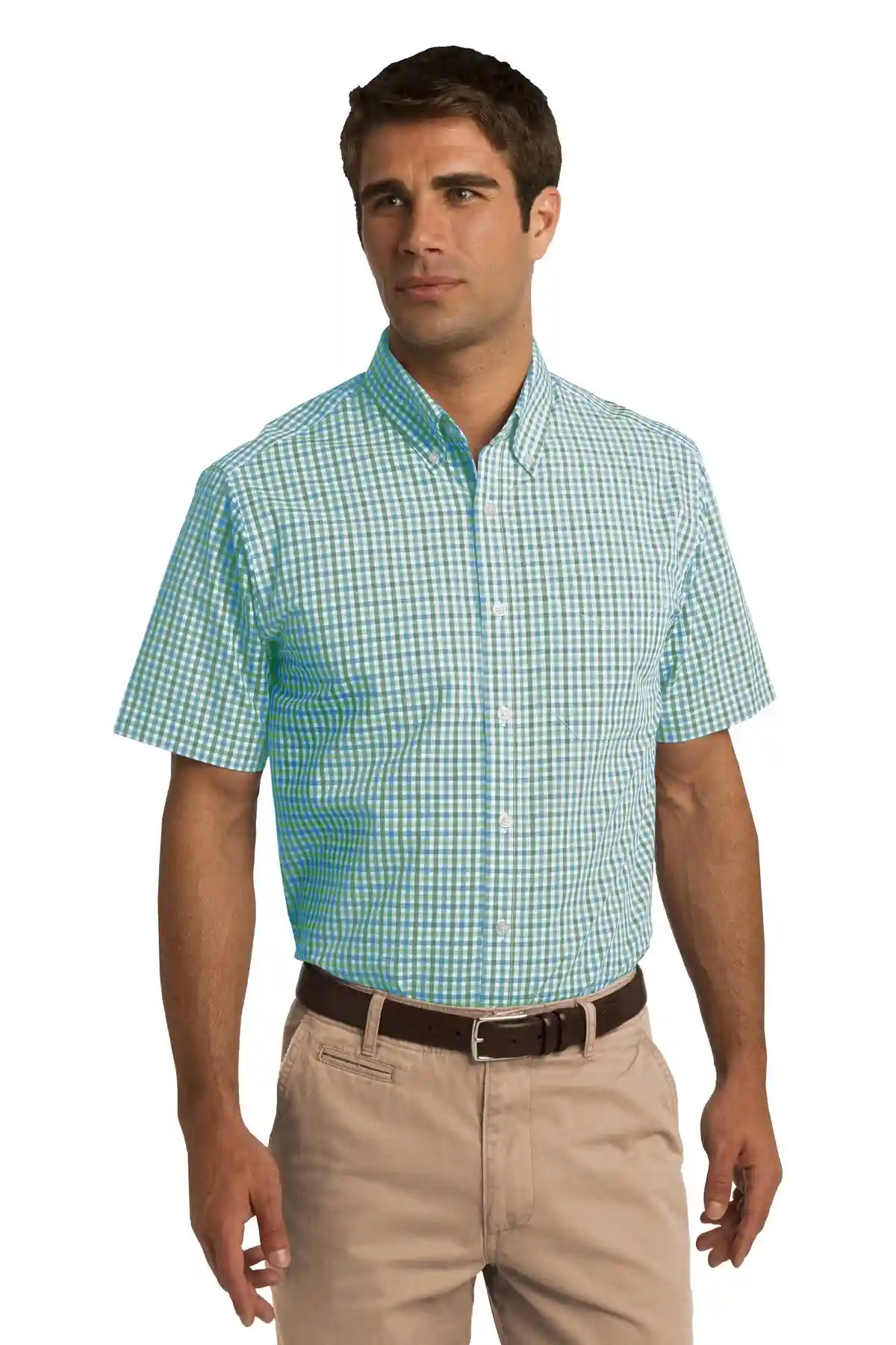 This short sleeve gingham shirt delivers the same professional polish as its long sleeve counterpart while optimizing breathability. Crafted from 3.2-ounce, 60/40 cotton/poly poplin, it features Easy Care performance for wrinkle resistance and long-lasting neatness. Bias-cut detailing inside the collar stand enhances structural refinement.