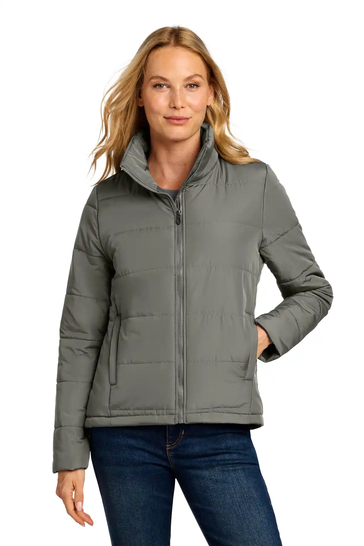 The Women’s Puffer Jacket combines contemporary style with functional insulation for everyday cold-weather wear. Featuring wider baffles, this jacket delivers a modern, fashion-forward look while maintaining excellent warmth. The water-resistant polyester shell helps protect against light rain and snow. Inside, polyfill insulation provides consistent heat retention without excessive weight. A molded center front zipper enhances durability and smooth operation. The interior storm flap adds an extra barrier against wind. Zippered hand pockets keep belongings secure, while an interior chest pocket offers additional storage. An adjustable hem with locking drawcord improves fit and heat retention. Designed for comfort and versatility, this jacket is ideal for both work and casual wear.