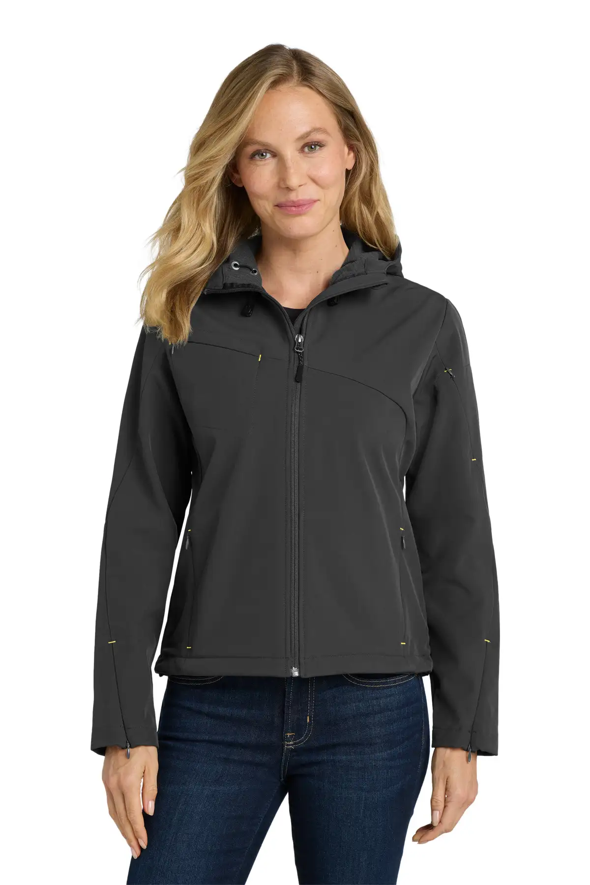 Designed to stand up to the elements, this hooded textured soft shell jacket delivers reliable protection with contemporary styling. The stretch woven shell allows freedom of movement while remaining wind-resistant and water-repellent. A bonded microfleece interior provides lightweight warmth. The adjustable hood offers added coverage in changing conditions. Princess seams create a flattering silhouette. Zippered chest and sleeve pockets add functionality and visual contrast. Ergonomic zipper pulls ensure easy use, even with gloves. Sleeve vents enhance breathability. With its modern details and performance features, this jacket transitions effortlessly from workday wear to weekend outings.