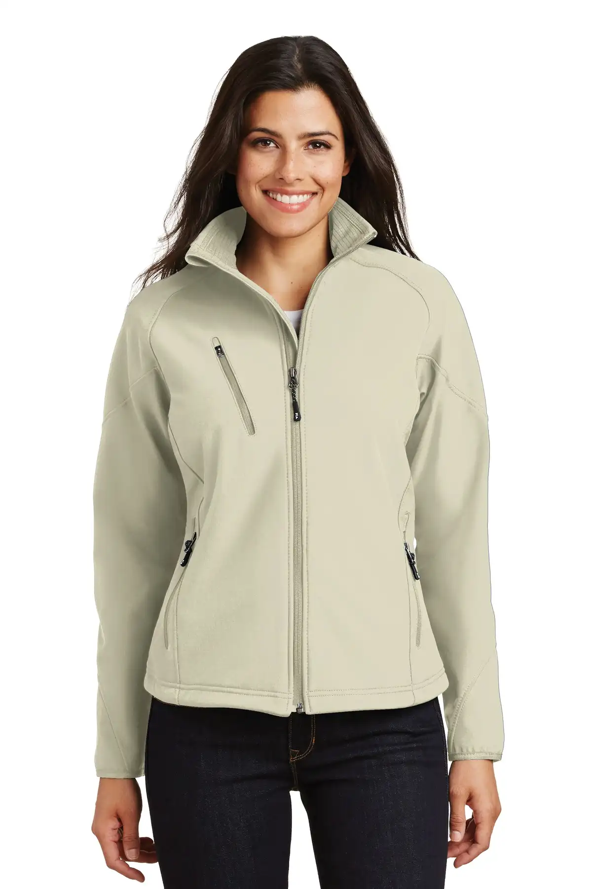 This textured soft shell jacket offers refined style combined with high-performance protection. The woven shell with stretch provides superior comfort and flexibility. A bonded microfleece interior adds warmth without added weight. Wind-resistant and water-repellent properties make it ideal for unpredictable conditions. The raglan silhouette allows optimal range of motion. Princess seams enhance the feminine fit. An angled zippered chest pocket adds both function and visual interest. Ergonomic zipper pulls ensure ease of use. Spandex-trimmed cuffs improve comfort and seal out cold air. Designed for everyday wear, this jacket balances sophistication and performance seamlessly.