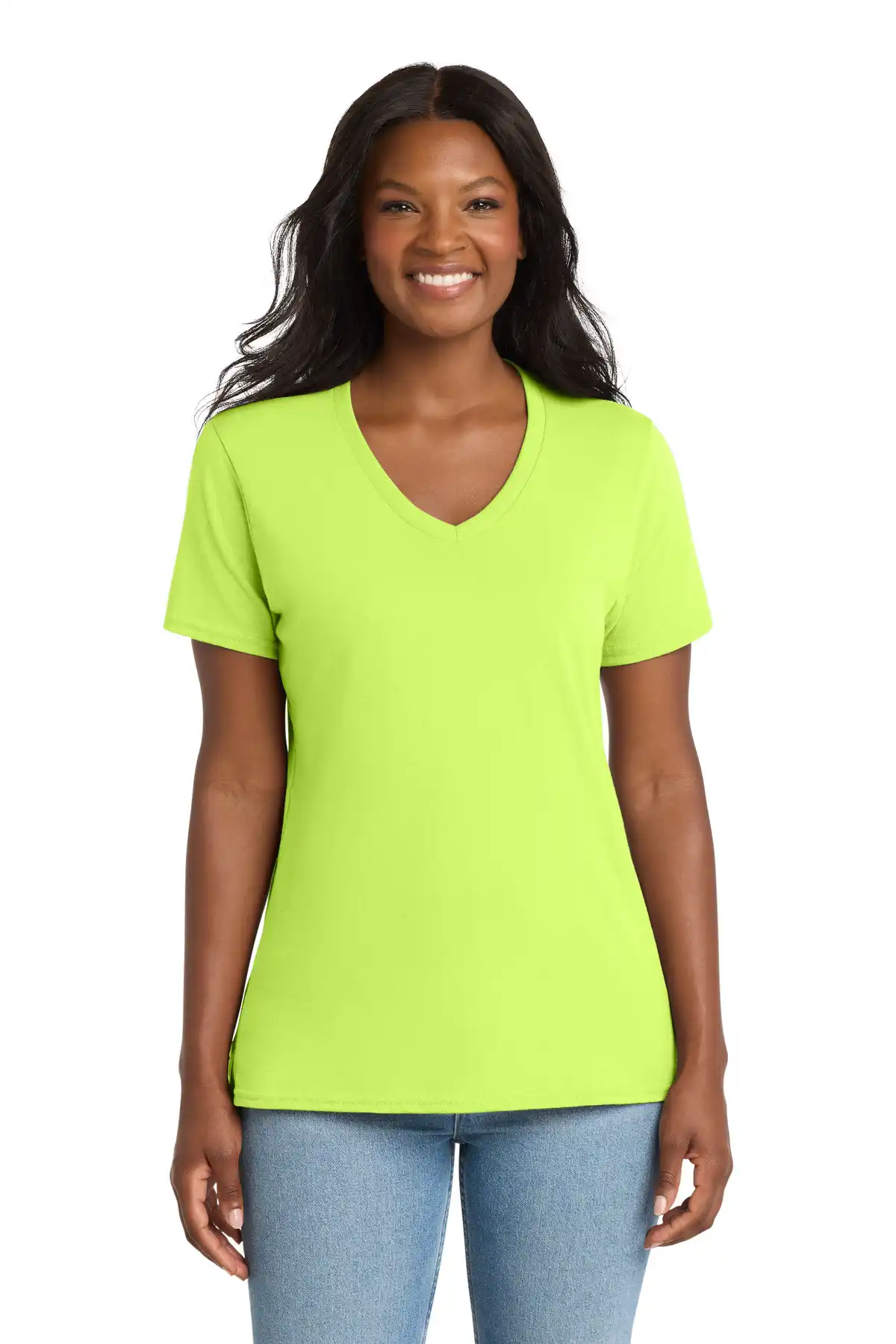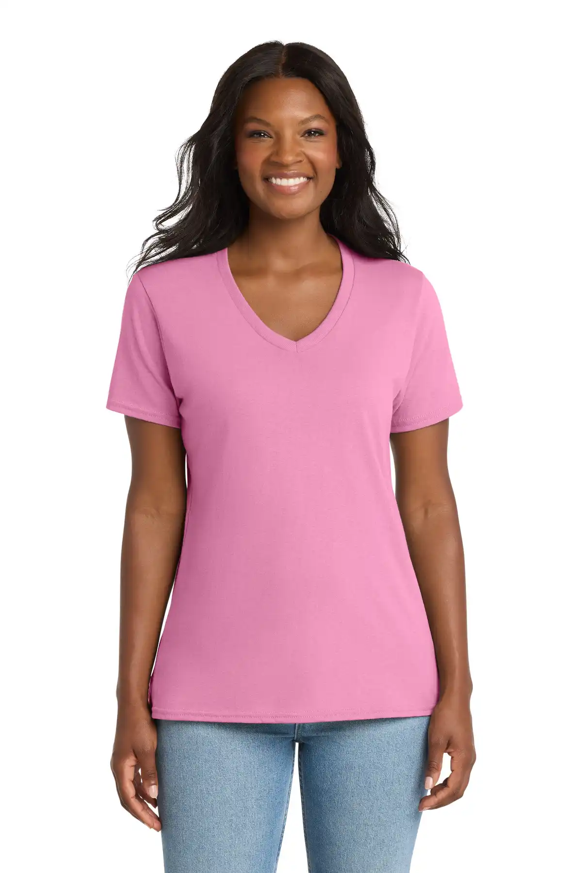 This women’s V-neck core cotton tee offers a modern update on a budget-friendly classic. Made from 5.4-ounce 100% cotton or cotton/poly blends (Neons 50/50, Athletic Heather 90/10, Ash 98/2), it features side seams and a contoured, feminine fit for a flattering silhouette. The soft, breathable fabric ensures all-day comfort, while the removable label allows for convenience and relabeling. Ideal for casual wear, layering, or team events, this tee combines practicality, style, and affordability.