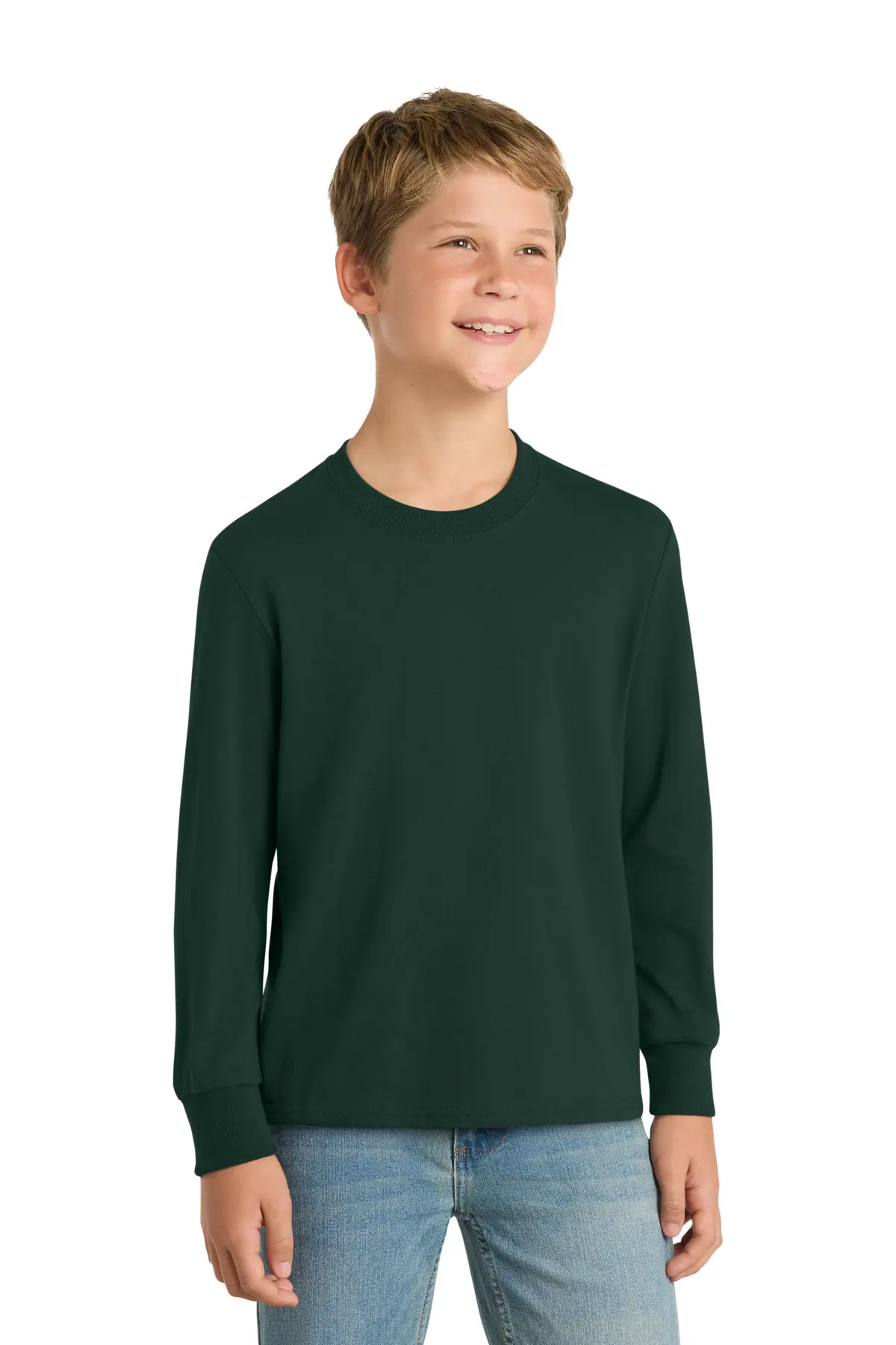 long sleeve youth tee with a classic silhouette, soft comfort, and durable construction. Made from 5.4-ounce, 100% cotton or cotton/poly blends depending on color, it features side seams for a flattering fit and 1x1 rib knit cuffs. Removable tags provide a tag-free experience. Lightweight yet warm, it’s perfect for school, sports, layering, or casual wear.