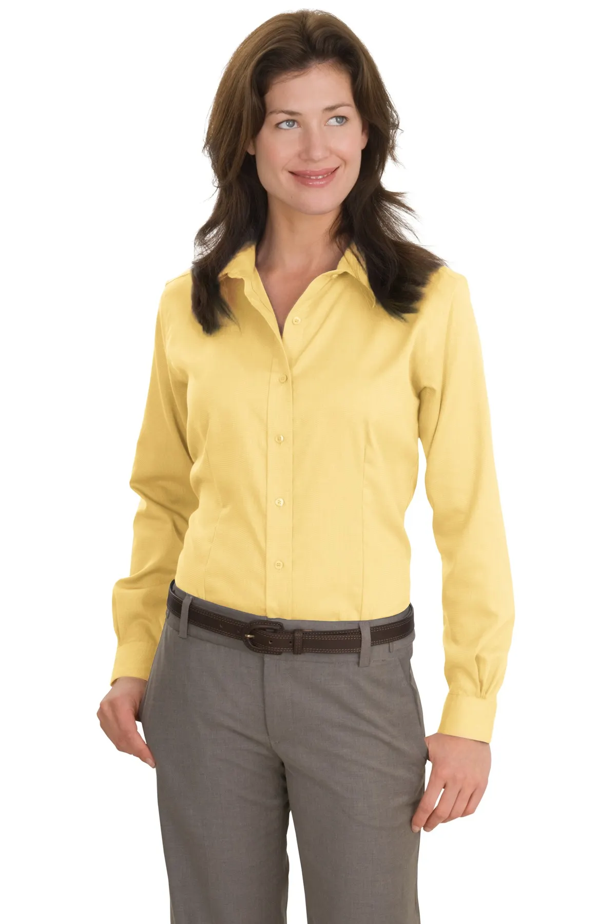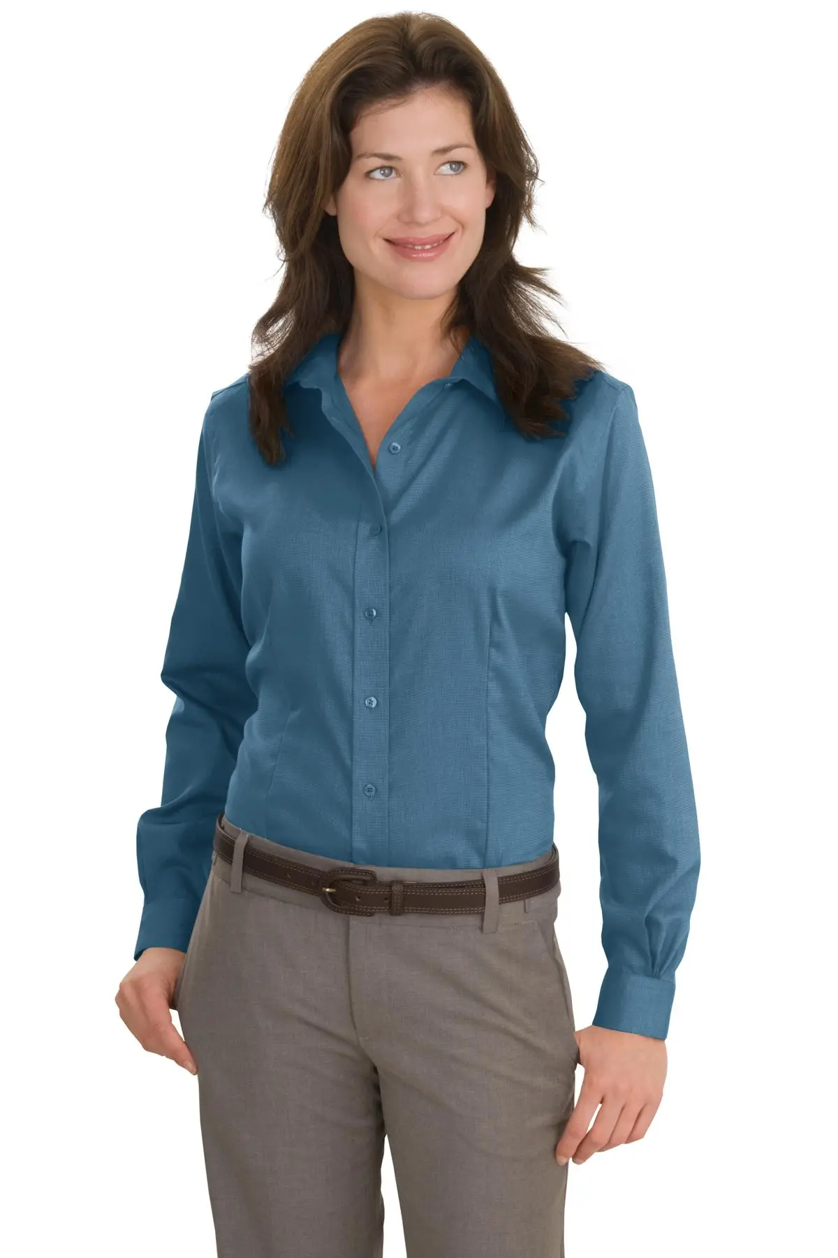 This ladies’ nailhead dobby shirt combines subtle texture with refined tailoring. Crafted from 100% cotton, the specialized dye process creates rich color depth. The non-iron finish enhances softness while maintaining wrinkle resistance. Designed with classic feminine styling, it features an open collar and front and back darts for contouring. Pucker-free single-needle tailoring ensures structural precision. Red House® engraved buttons and sleeve monogram detailing complete the elevated design.