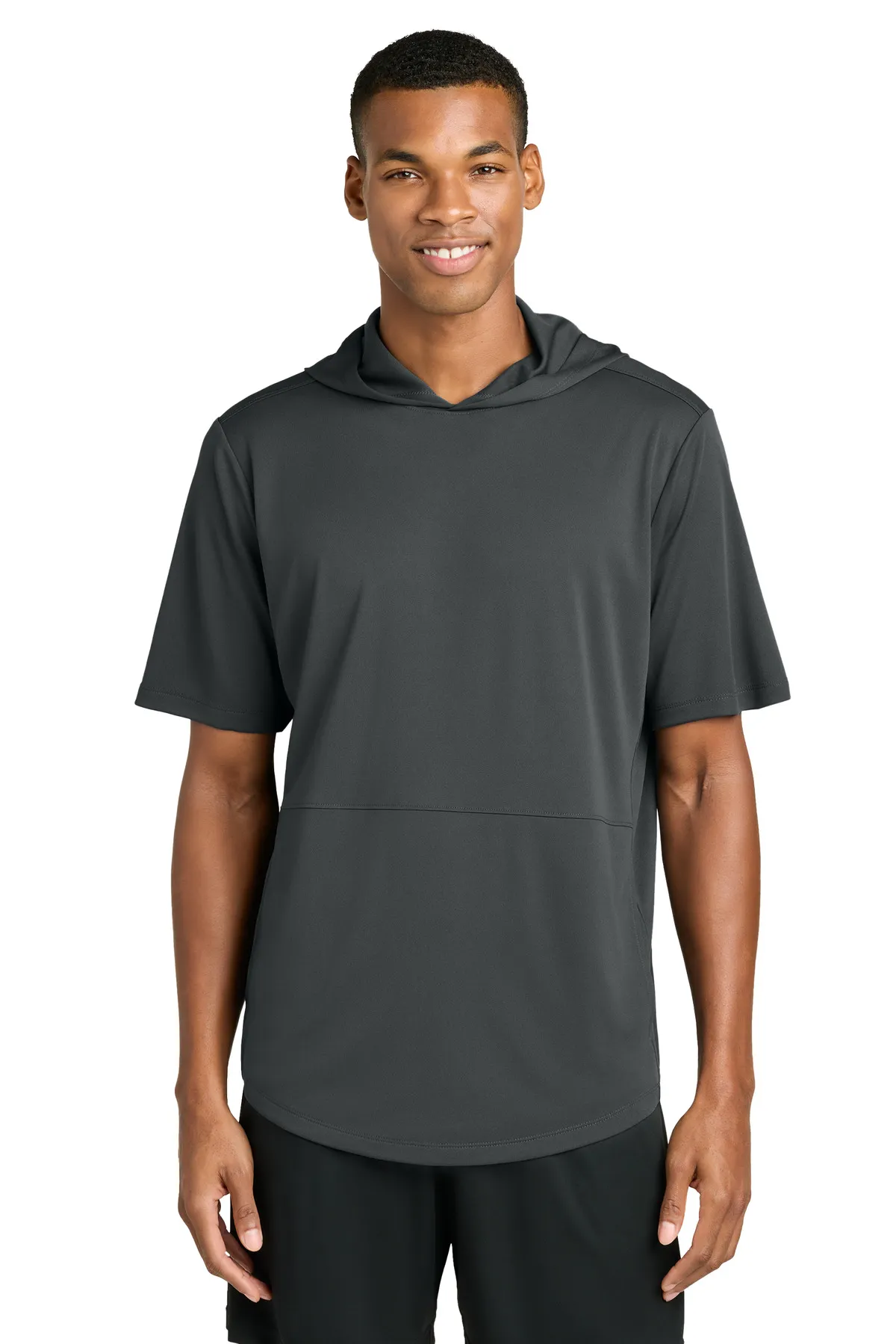 A short sleeve hoodie with recycled polyester and PosiCharge technology for lasting color. Moisture-wicking, odor-fighting, and snag-resistant for durable performance. Three-piece hood offers structure and protection. Front kangaroo pocket provides storage. Lightweight and breathable for all training conditions. Tear-away label allows comfort and relabeling.