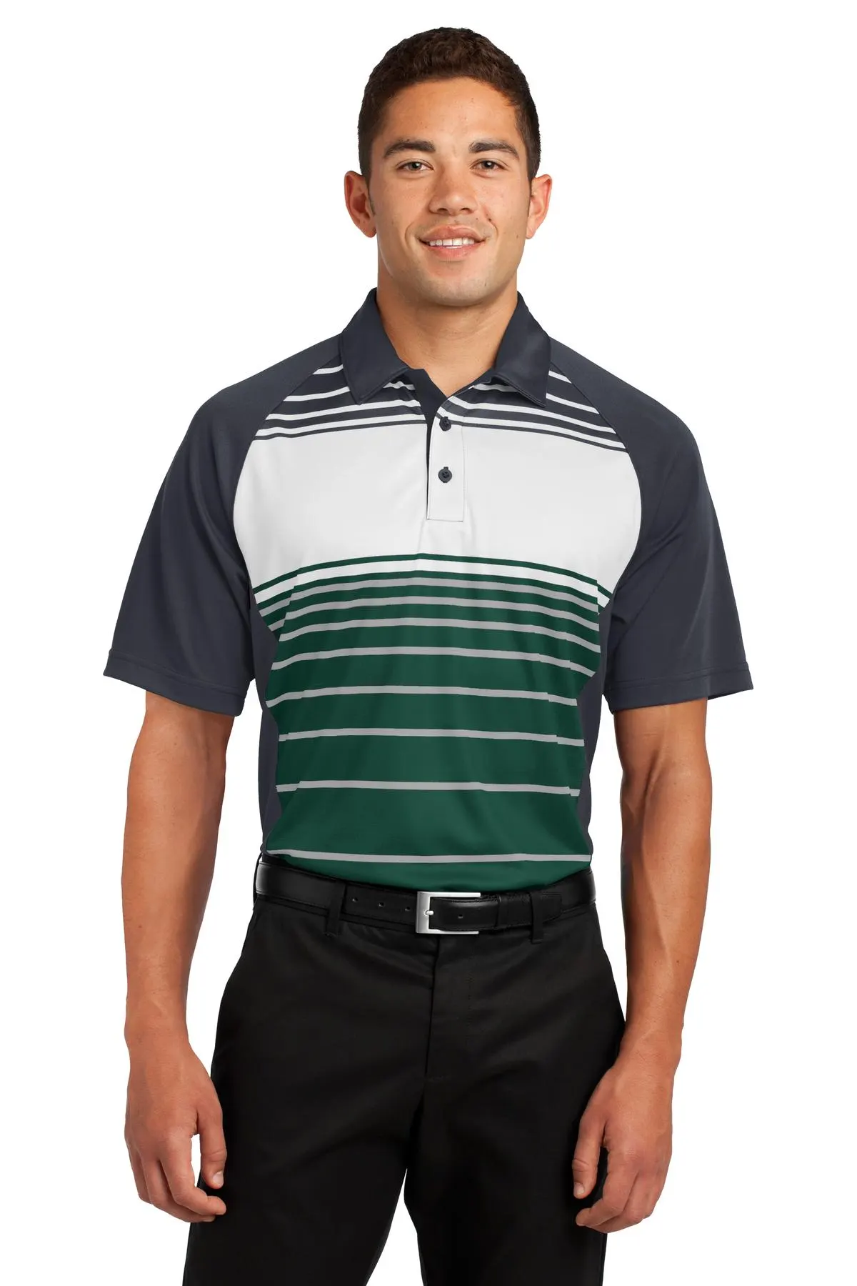 Crisp sublimated stripe front panel elevates this classic Dry Zone polo. Moisture-wicking, odor-fighting polyester ensures comfort during high-intensity activities. Mini pique construction provides breathable stretch. Ribbed collar with 3-button placket enhances style, while raglan open sleeves improve mobility. Double-needle hem and sleeves guarantee durability. Perfect for teams, outdoor work, or active leisure.