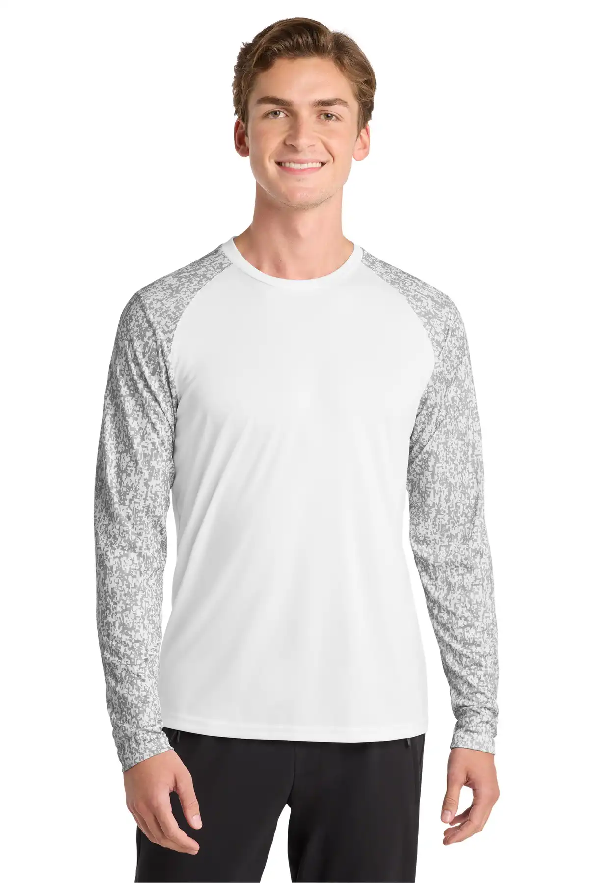 Full-length sleeve tee with sublimated digi camo print for a modern, athletic look. Moisture-wicking, breathable polyester keeps you dry and comfortable. Digi camo print extends to sleeves for consistent design. Removable tag enhances comfort and allows relabeling. Lightweight construction ideal for layering. Set-in sleeves ensure full mobility.