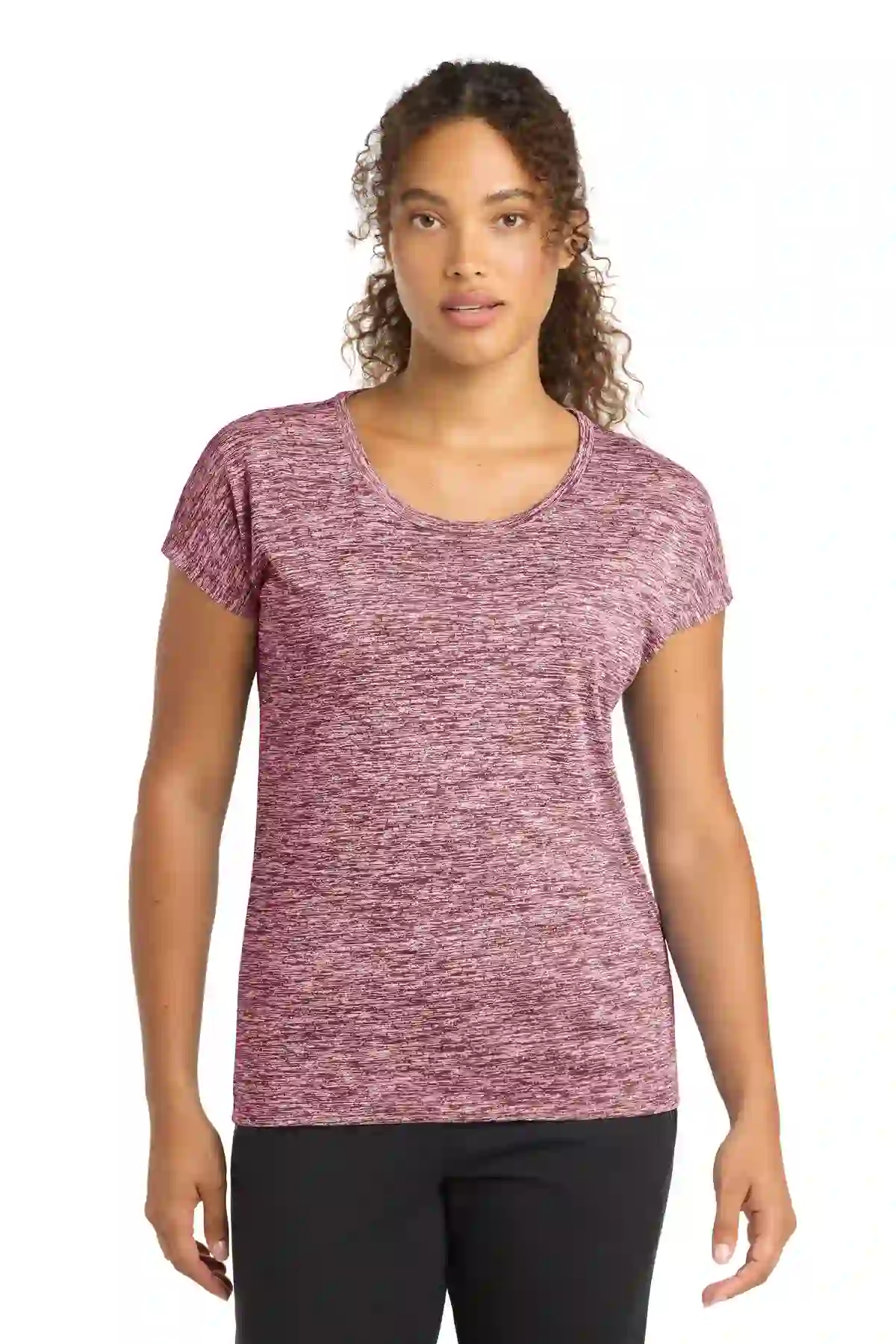 This Electric Heather Sporty Tee delivers vibrant heather styling with high-performance moisture control. Soft polyester jersey construction ensures lightweight comfort. PosiCharge technology locks in color for long-term durability. Dolman sleeves create a relaxed silhouette and enhanced range of motion. Scoop neckline maintains a clean athletic profile. Designed for energetic training sessions and active lifestyles.