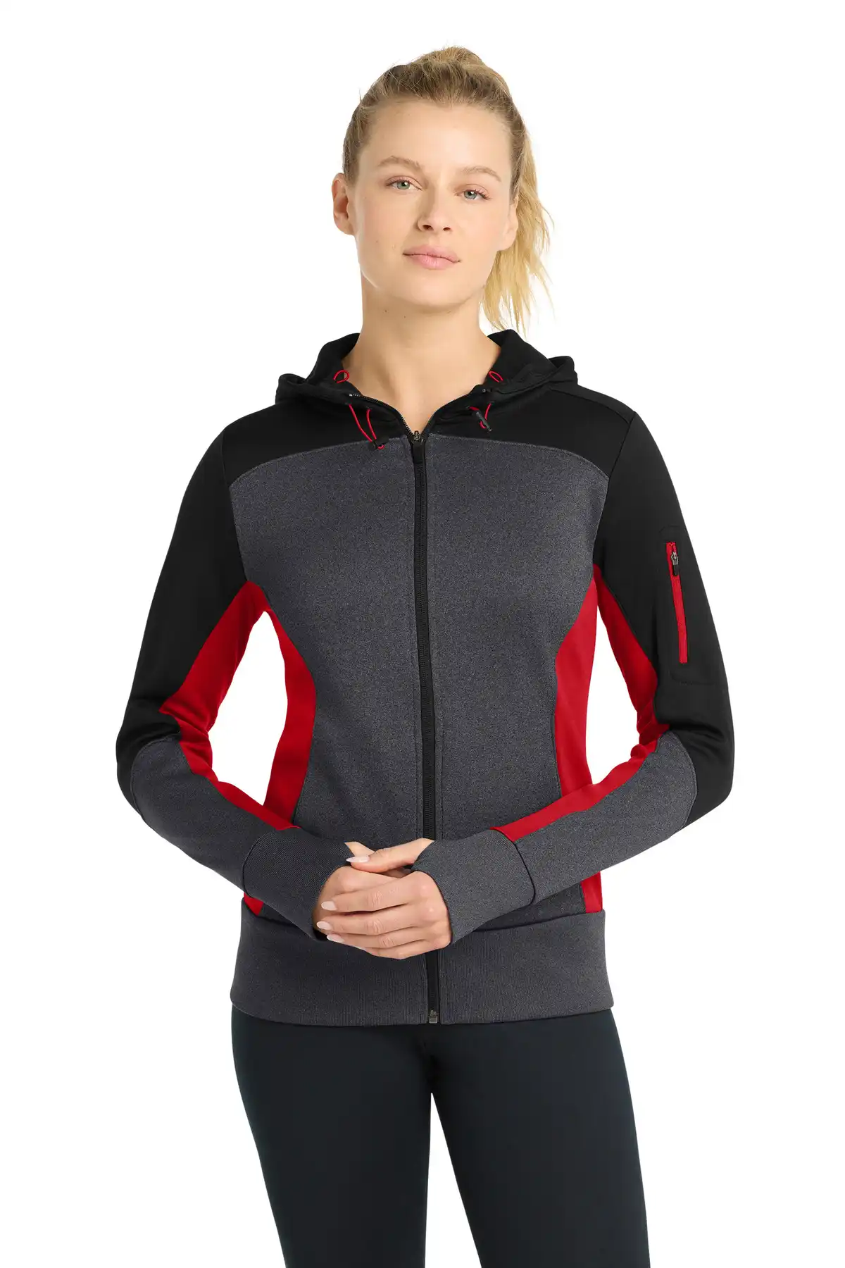 This Tech Fleece jacket combines snag resistance with bold colorblock styling. Moisture-wicking double-knit construction supports active movement. Media pocket with headphone port enhances functionality. Thumbholes provide added warmth. Princess seams create a contoured fit. Designed for performance with modern athletic detailing.