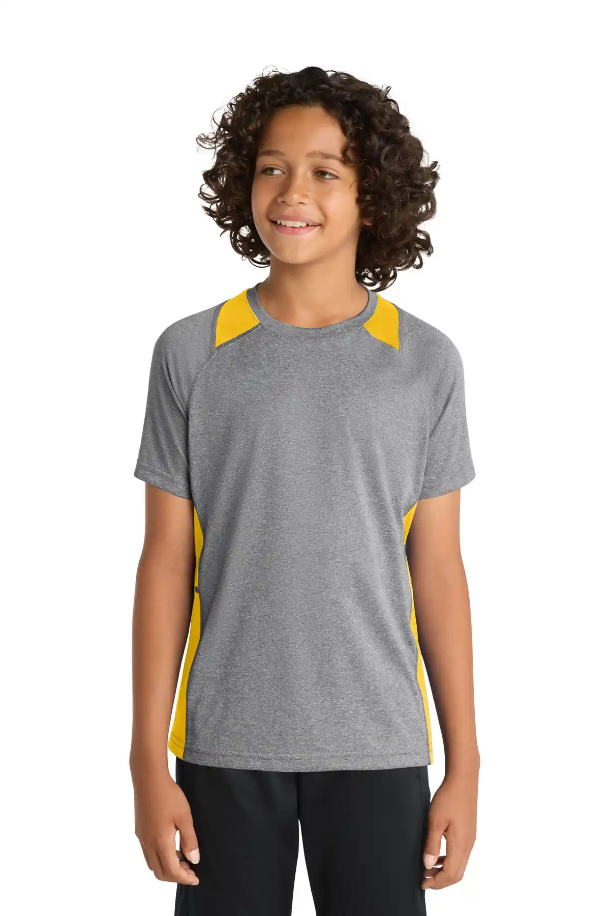 The Youth Heather Colorblock Contender Tee provides a modern athletic look with color accents at the neck and sides while offering exceptional breathability and moisture-wicking performance. Constructed from 3.8-ounce, 100% polyester jersey with matching 3.8-ounce polyester interlock panels, it is lightweight, snag-resistant, and ideal for active youth. Its raglan sleeves allow full range of motion.