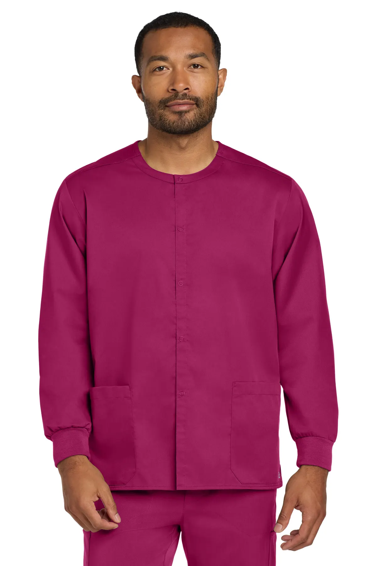 A versatile scrub jacket designed for easy layering and professional wear. Mechanical stretch fabric ensures mobility. Five-snap front closure allows quick dressing, and rib knit cuffs provide secure sleeve fit. Shoulder badge loop and top-loading pockets (with hidden accessory loops) add utility. Side vents enhance comfort while moving. Wink heat transfer logo at left pocket emphasizes brand recognition.